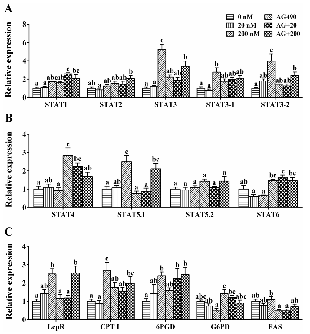 Freshly isolated hepatocytes of S. hasta were incubated with high-performance liquid chromatography (HPLC)-purified recombinant human leptin (rt-hLEP, Sigma, Carlsbad, CA, USA) and/or AG490 (JAK2-STAT specific inhibitor, Sigma). Here, six groups were designed as follows: control (containing 0.1% DMSO, dimethyl sulfoxide, sigma), leptin (20 ng/mL), leptin (200 ng/mL), AG490 (20 µM), leptin (20 ng/mL) + AG490 (20 µM), leptin (200 ng/mL) + AG490 (20 µM), respectively. Each treatment was performed in quadruplicate. The inhibitor was added 2 h prior to the addition of leptin. The concentration of leptin and specific inhibitor was selected according to our preliminary experiment and to previous in vitro studies in fish and mammals [,,,]. The cells were gathered for the following analysis after 48 h. Lyophilized leptin was dissolved in 1× PBS and AG490 was dissolved in DMSO. The maximal DMSO concentration applied to cells in culture did not exceed 0.1%, and had no major effect on cell viability and parameters.