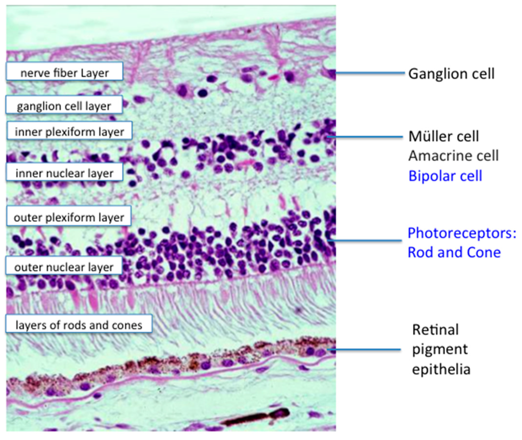 Histology of a normal retina. Retinal ganglion cell, Müller cell, and retinal pigment epithelia are the main stem cell of the retina. (hematoxylin & eosin, ×100).