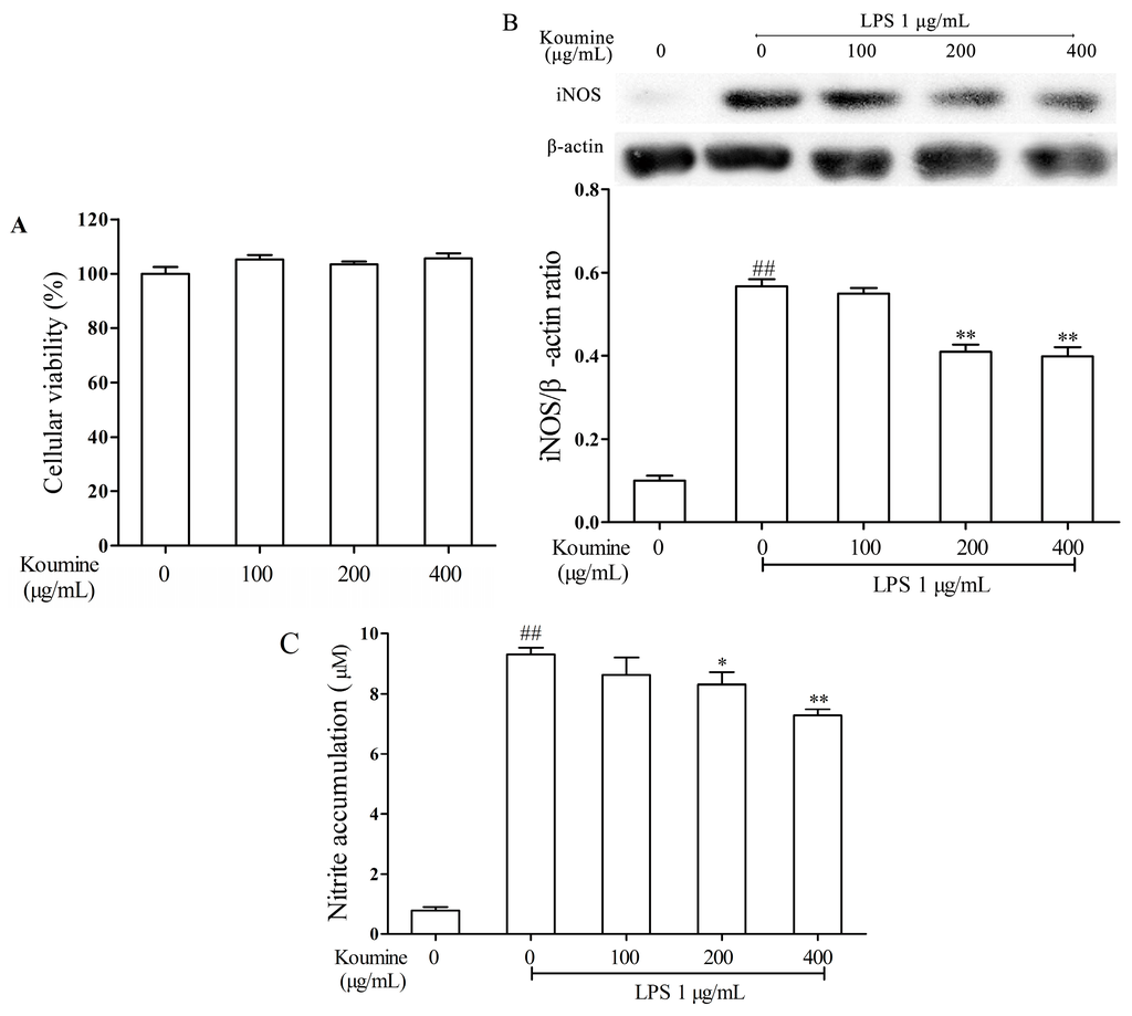 Koumine significantly inhibited production of NO and expression of iNOS in LPS-treated RAW264.7 macrophages. The inhibitory effects of koumine were noticeable at 200 μg/mL concentration, while its maximum effect was observed at 400 μg/mL concentration. With no LPS treatment, koumine alone produced no significant influence on NO production and iNOS expression in RAW264.7 macrophages.