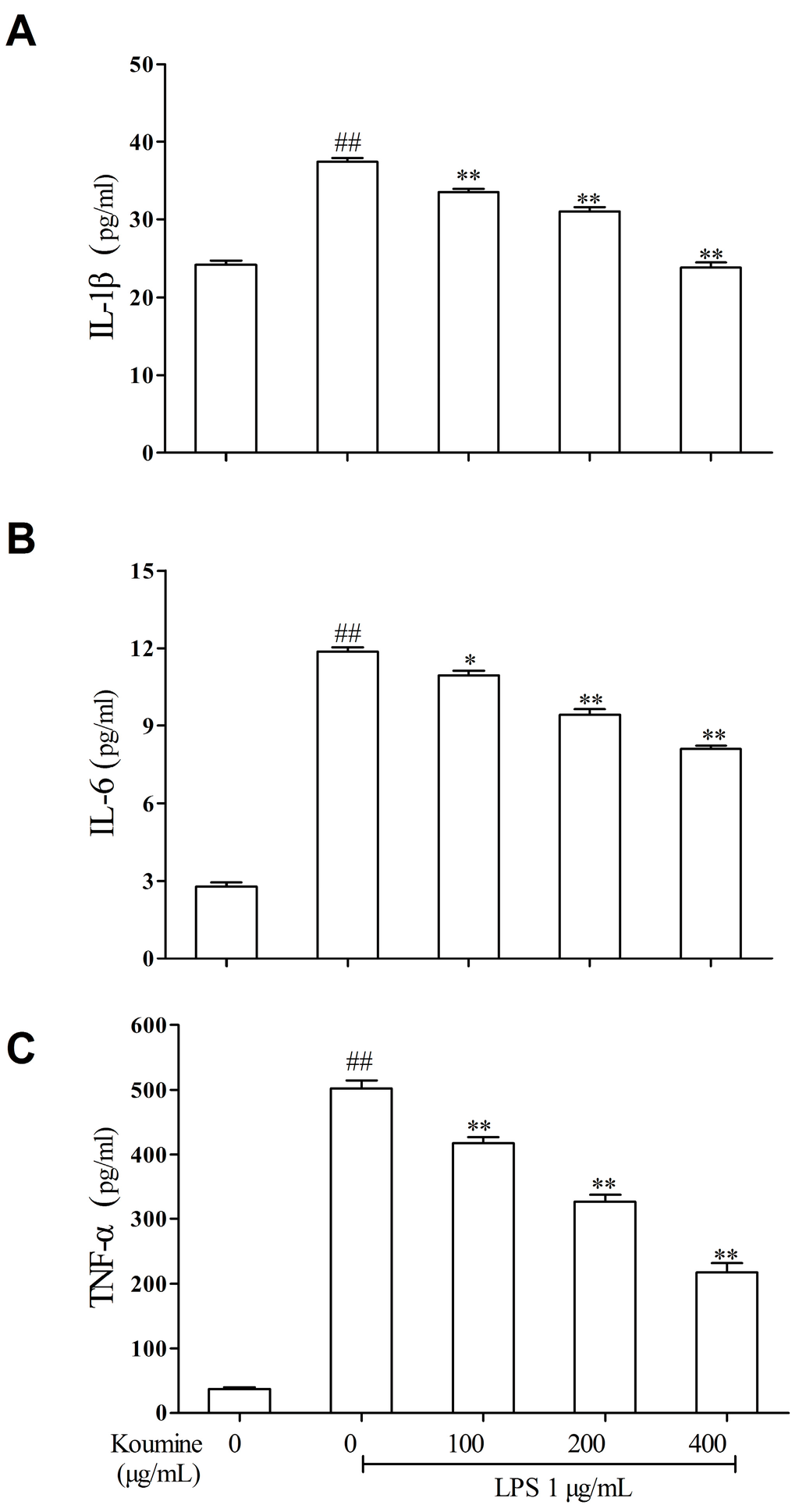 Inhibitory effect of koumine on the pro-inflammatory cytokine production in RAW264.7 cells. The production of: (A) interleukin (IL)-1β; (B) IL-6; and (C) tumor necrosis factor-α (TNF-α) were assayed in the culture medium of cells stimulated with 1 μg/mL lipopolysaccharide (LPS) for 18 h in the presence of 100, 200 or 400 μg/mL koumine. After culture supernatants were collected, equal volume of cell-free culture media (100 μL) was reacted with Griess reagent and the absorbance at 540 nm was measured. The data were expressed as mean ± standard deviations (SD) (n = 3). ## p < 0.01 vs. control group; * p < 0.05 and ** p < 0.01 vs. LPS group, respectively.