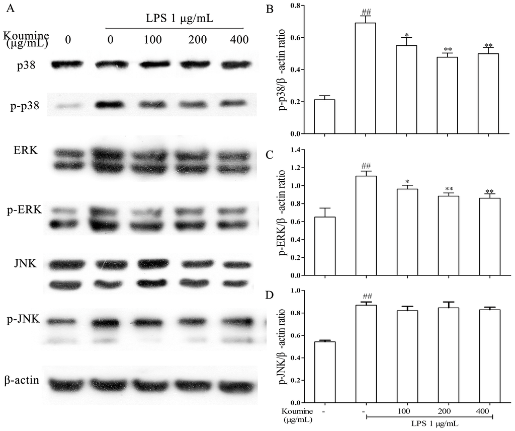 Effect of koumine on the expression of MAPK signaling pathway in LPS-stimulated RAW264.7 cells. Cells were pretreated with 100, 200 or 400 μg/mL koumine for 1 h, and treated with 1 μg/mL LPS in the mediums containing koumine for 18 h. Equal amounts of protein in cell lysates were analyzed by Western blot. The β-actin protein levels were used to confirm that equal amounts of protein were subjected to electrophoresis. (A) The expression levels of phosphorylation p38 (p-p38), phosphorylation extracellular signal-regulated protein kinase (p-ERK), and phosphorylation c-Jun terminal kinase (p-JNK) proteins; (B) The quantification histogram of p-p38 protein expression normalized by β-actin; (C) The quantification histogram of p-ERK protein expression normalized by β-actin; and (D) The quantification histogram of p-JNK protein expression normalized by β-actin. The data were expressed as mean ± standard deviations (SD), (n = 3). ## p < 0.01 vs. control group; * p < 0.05 and ** p < 0.01 vs. LPS group, respectively.