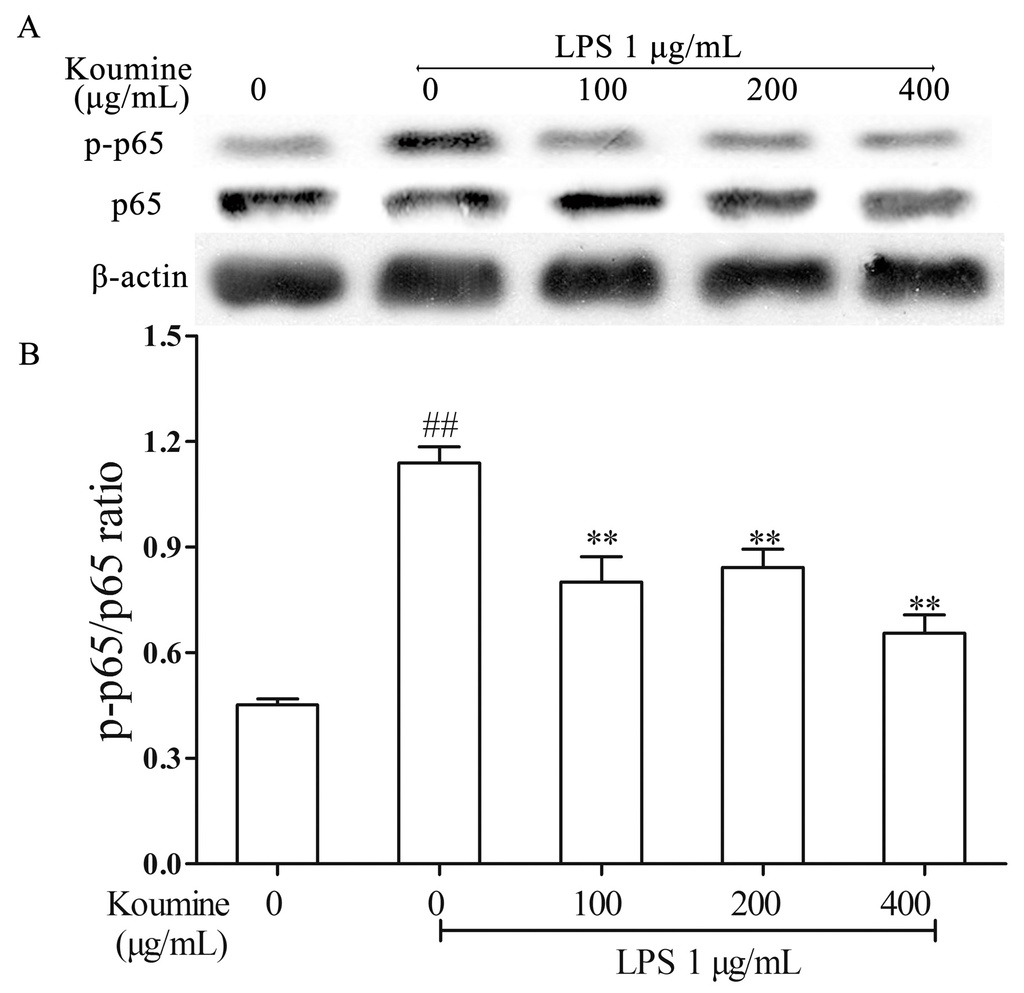 Effect of koumine on the expressions of p-p65 and p65 proteins in LPS stimulated RAW264.7 cells. Cells were pretreated with 100, 200 or 400 μg/mL koumine for 6 h. Subsequently, cells were treated with 1 μg/mL LPS in the mediums containing koumine for 1 h. Equal amounts of p65 and p-p65 proteins in cell lysates were analyzed by Western blot. (A) The expression levels of p-p65 and p65; and (B) The quantification histogram of p-p65 protein expression normalized by p65. The data were expressed as mean ± standard deviations (SD) (n = 3). ## p < 0.01 vs. control group; ** p < 0.01 vs. LPS group.