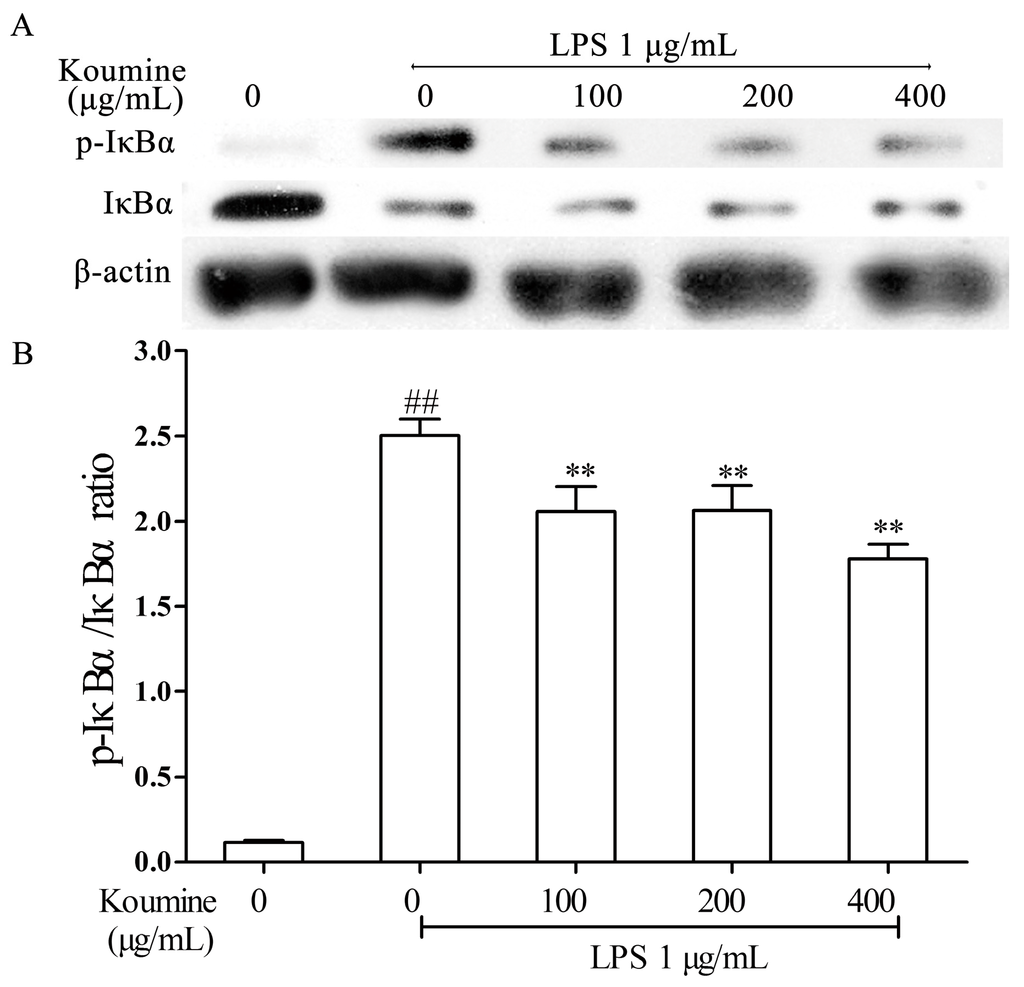Effect of koumine on the expression of p-IκBα and IκBα in LPS stimulated-RAW264.7 cells. Cells were pretreated with 100, 200 or 400 μg/mL koumine for 6 h. Subsequently, cells were treated with 1 μg/mL LPS in the mediums containing koumine for 30 min. Equal amounts of protein in cell lysates were analyzed by Western blot. The β-actin protein levels were used to confirm that equal amounts of protein were subjected to electrophoresis. (A) The expression levels of p-IκBα and IκBα; and (B) The quantification histogram of p-IκBα protein expression normalized by β-actin. The data were expressed as mean ± standard deviations (SD) (n = 3). ## p < 0.01 vs. control group; ** p < 0.01 vs. LPS group.