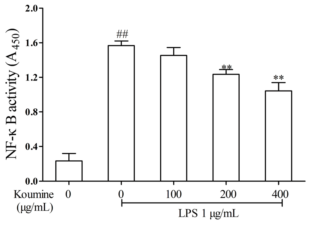 ELISA assay was used to determine koumine’s effect on DNA-binding activity of NF-κB in LPS-treated RAW264.7 macrophages. Compared with the control, the DNA-binding activity of NF-κB following LPS stimulation for 1 h was shown to be significantly higher (p < 0.01). On the other hand, LPS-induced NF-κB DNA-binding activity was inhibited by 100, 200 and 400 μg/mL koumine in RAW264.7 cells, as shown in Figure 6.