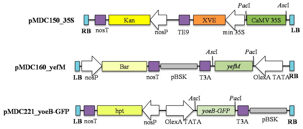 - Abu Bakar, F.; Yeo, C.C.; Harikrishna, J.A. Expression of the Streptococcus pneumoniae yoeB Chromosomal toxin gene causes cell death in the model plant Arabidopsis thaliana. BMC Biotechnol. 2015, 15. [Google Scholar] [CrossRef] [Green Version]