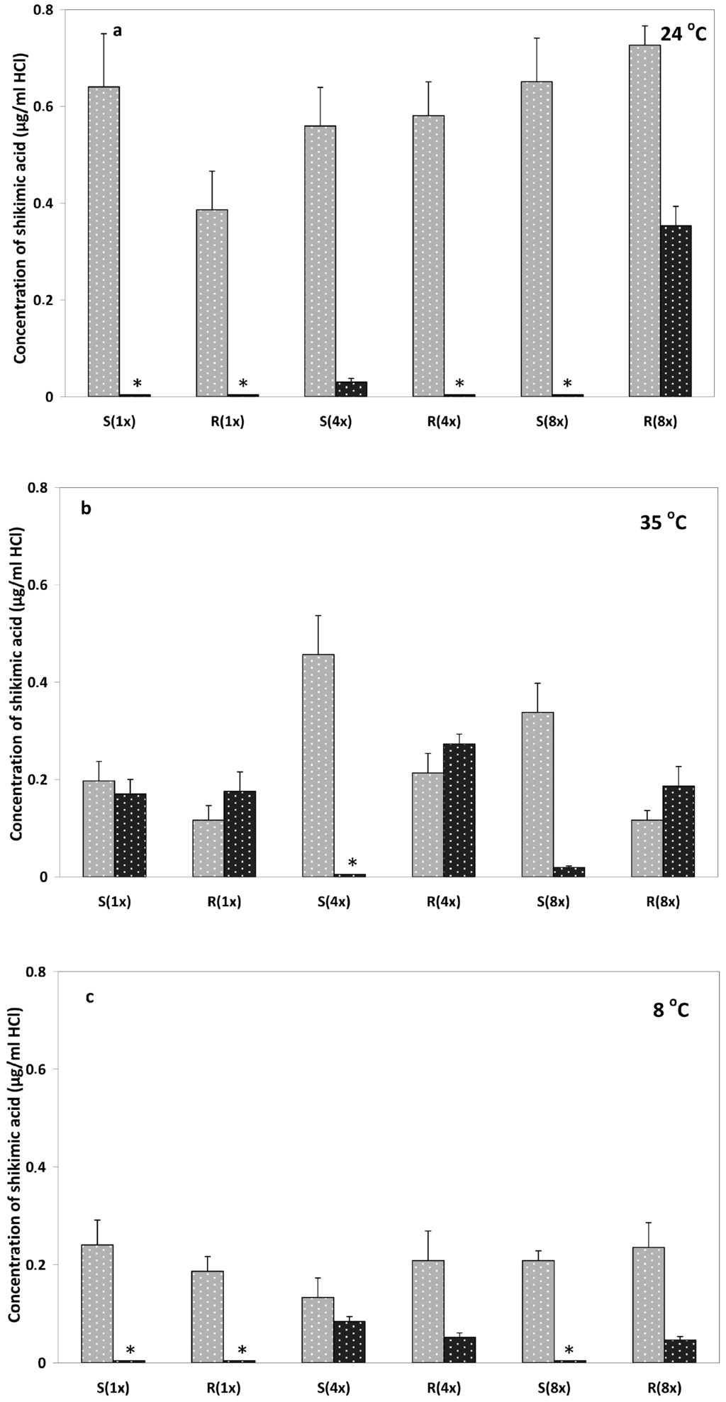 Shikimic acid determination at four days after treatment (DAT). Shikimate levels are reported as micrograms of 1 shikimic acid per mL of HCl solution (a) at 24 °C; (b) at 35 °C; (c) at 8 °C (grey columns represent measurements taken from plants grown in light conditions, whereas black columns in dark conditions). Asterisks denote values close to zero.