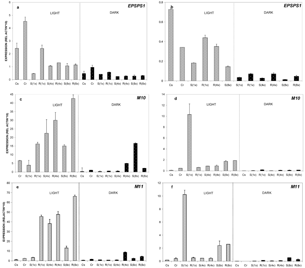 Relative expression of EPSPS1 (a,b), M10 (c,d), and M11 (e,f) genes analyzed by real time PCR. Leaf samples were taken from plants grown at 24 °C. Relative quantification was obtained through the delta-delta-Ct algorithm (2ΔΔCt) method using actin as the reference gene. As a reference sample, the untreated (control) plants from the susceptible biotype (Cs) was chosen. Data represent the average from three biological replicates and the error bars indicate the standard deviation. The following plant–treatment combinations were studied: Cs susceptible biotype-untreated control; Cr resistant biotype-untreated control; S(1x) susceptible biotype- glyphosate sprayed, dose 1x; R(1x) resistant biotype-glyphosate sprayed, dose1x; S(8x) susceptible biotype-glyphosate sprayed, dose 8x; R(8x) resistant biotype-glyphosate sprayed, dose 8x. Relative expression ratios were estimated one and four days after glyphosate treatment (1 DAT—diagrams on the left and 4 DAT—diagrams on the right).