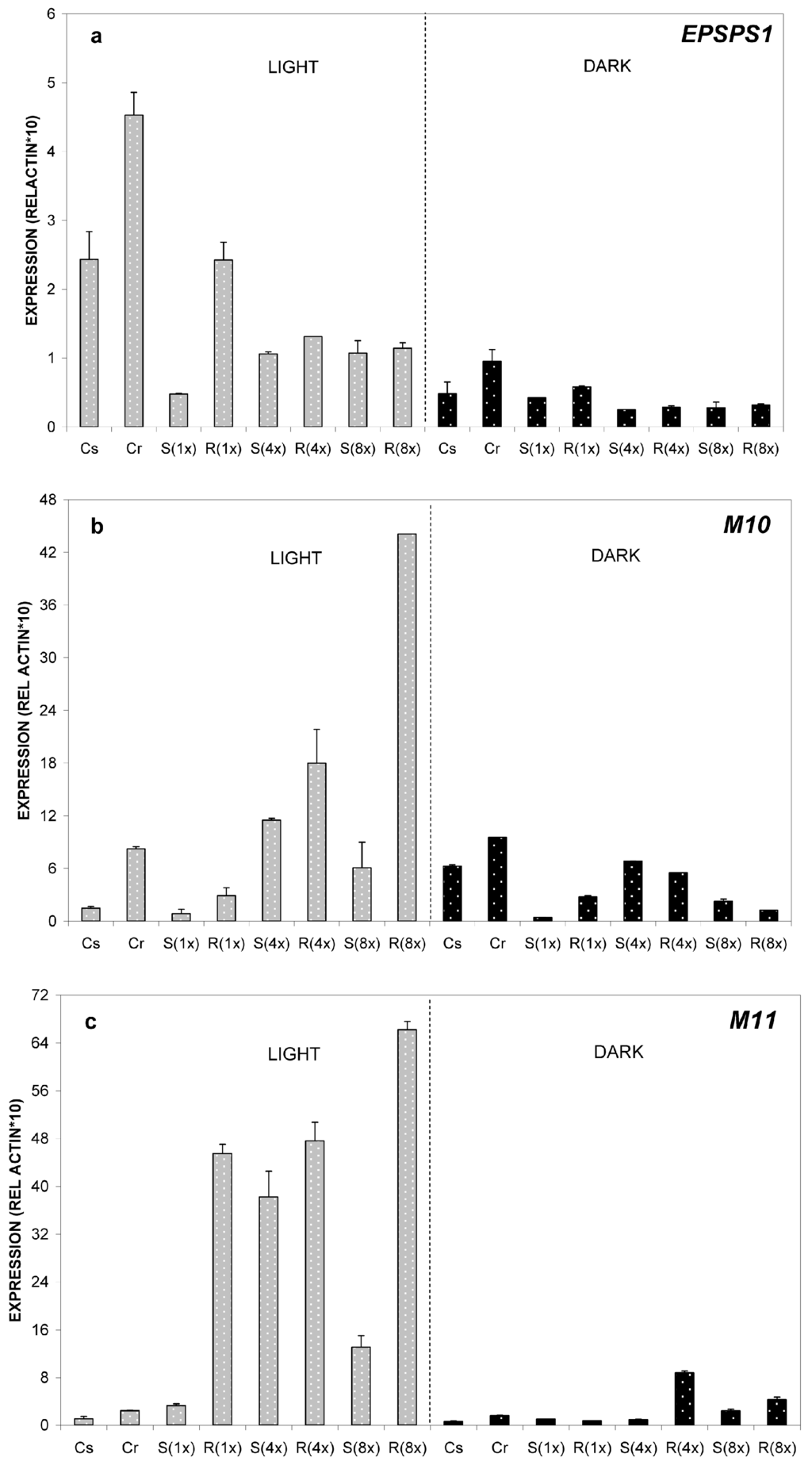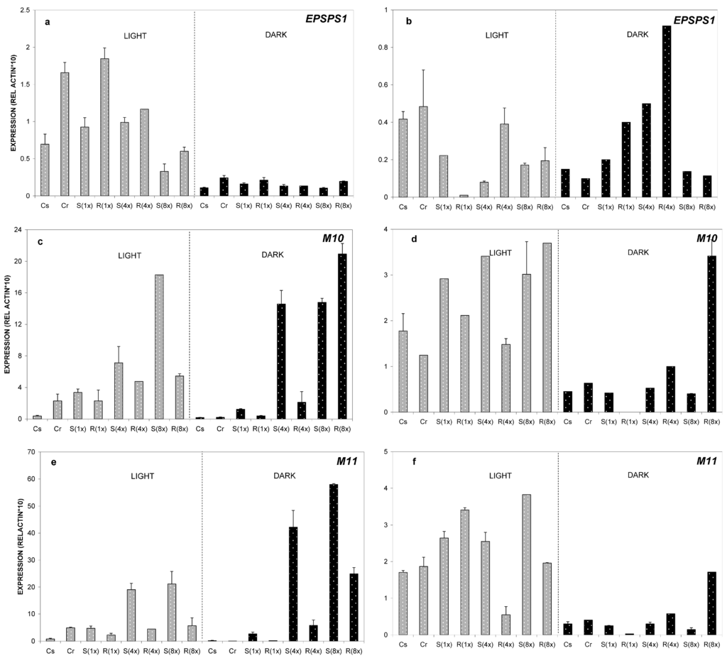 Regarding EPSPS relative expression, the differences that were detected between GS- and GR-populations were not statistically significant. In dark conditions, differences in the relative expression between the two populations were even smaller (Figure 3a).