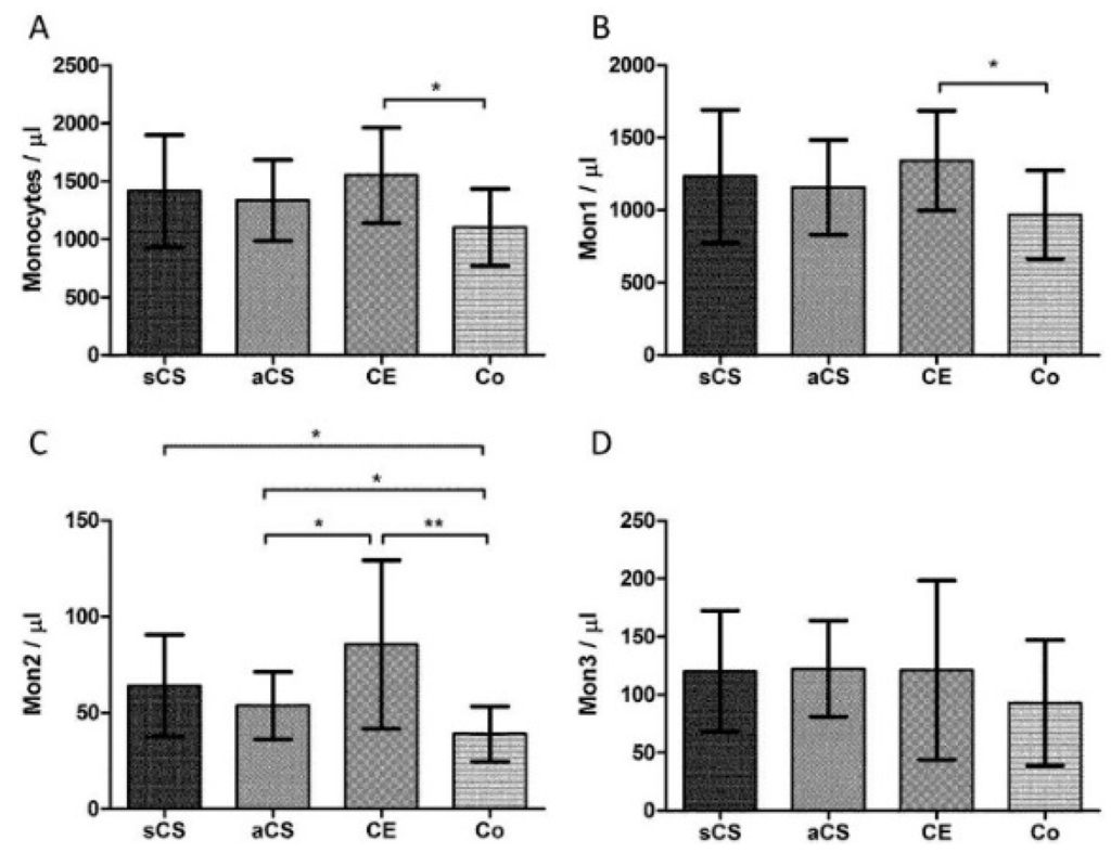 Absolute counts of Mon2 showed significant differences with higher counts in sCS vs. Co (p = 0.015), aCS vs. Co (p = 0.049), and CE vs. Co (p = 0.006) (Figure 1C). For Mon1 and total monocytes differences were observed between CE and Co (p = 0.014 and p = 0.011, respectively) (Figure 1A,B). There were no differences of monocyte counts between sCS and aCS. Additionally, for Mon3, no differences could be found within the study population (Figure 1D).