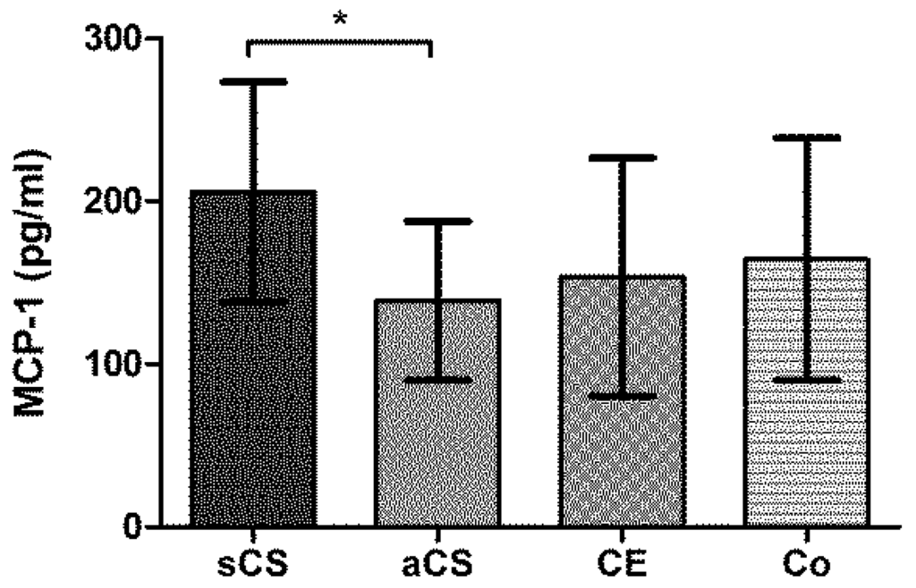 Levels of MCP-1 and FKN were determined in peripheral venous blood samples which have been centrifuged with 3000 rpm for 10 min and then stored at −80 °C until measurement. Measurements were performed using ELISA-Kits (R and D Systems, Inc., Minneapolis, MN, USA). For measuring MCP-1 there were eight samples available for group sCS, nine for aCS, and 10 each for CE and Co. FKN could be measured in nine samples in each sCS and aCS, in 11 samples of CE, and 10 of Co. Furthermore, complete blood cell counts, creatinine-levels, and high-sensitive C-reactive-protein (hs-CRP) levels were provided.