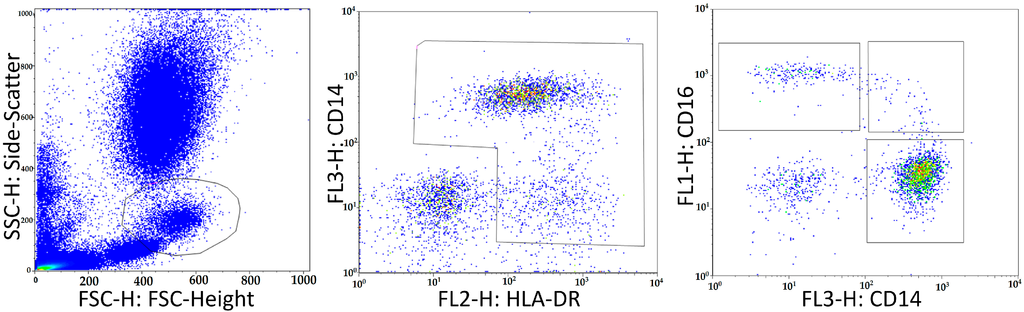 Monocyte subsets were measured in whole blood samples using quantitative fluorescence-activated cell sorting (FACS)–analysis (FACScalibur, Becton, Dickinson and Company, Franklin Lakes, NJ, USA) with following antibodies: CD14 PerCP (clone MΦP9, Becton, Dickinson and Company), CD16 FITC (clone 3G8, Biolegend, San Diego, CA, USA), HLA-DR PE (clone L243, Biolegend). 100 µL of whole blood anticoagulated with EDTA were mixed with 10 µL of each antibody in a TruCount™ tube (Becton, Dickinson and Company). After incubation for 15 min erythrocytes were lysed according to the recommendations of the manufacturer. After another 15 min incubation time FACS-analysis was performed using BD CellQuest™ Pro (Becton, Dickinson and Company). Gating of monocytes was done using FlowJo (TreeStar Inc, Ashland, OR, USA). The gating strategy was based on selection of total monocytes in the forward scatter (FSC)/side scatter (SSC)-plot. In a CD14/HLA-DR-Plot HLA-positive cells could be identified and gated to exclude lymphocytes. Finally, the three monocyte subsets could be measured in a CD16/CD14-plot (see Figure 3). Using the TruCount™-System allowed to measure absolute monocyte counts.