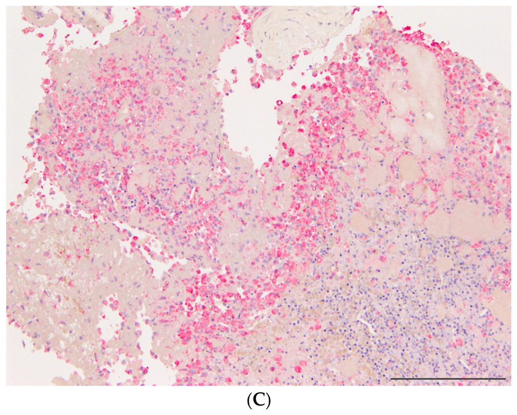 - Radzun, H.J.; Hansmann, M.L.; Heidebrecht, H.J.; Bodewadt-Radzun, S.; Wacker, H.H.; Kreipe, H.; Lumbeck, H.; Hernandez, C.; Kuhn, C.; Parwaresch, M.R. Detection of a monocyte/macrophage differentiation antigen in routinely processed paraffin-embedded tissues by monoclonal antibody Ki-M1P. Lab. Investig. 1991, 65, 306–315. [Google Scholar] [PubMed]