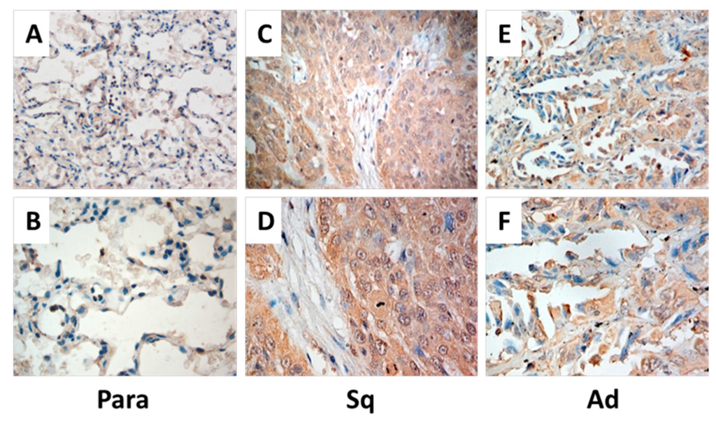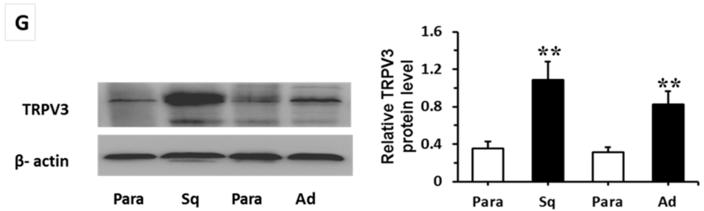 Expression of TRPV3 in human NSCLCS. Immunohistochemical staining of TRPV3 was examined in cancerous tissues and their corresponding paracancerous tissues. Brown grains represented positive signals. The positive expression site of TRPV3 was mainly localized in the cell membrane and cytoplasm of tumor cells. TRPV3 negative expression was in paracancerous tissue (Para) (A,B), and TRPV3 positive expression was in lung squamous cell carcinoma (Sq) (C,D) and lung adenocarcinoma (Ad) (E,F). (A,C,E) 200×; and (B,D,F) 400×. The expression of TRPV3 in lung Ad, lung Sq, and Para (G) was determined by Western blot. Each bar represents the mean ± SD of three independent experiments. ** p < 0.01 compared with paracancerous tissue.