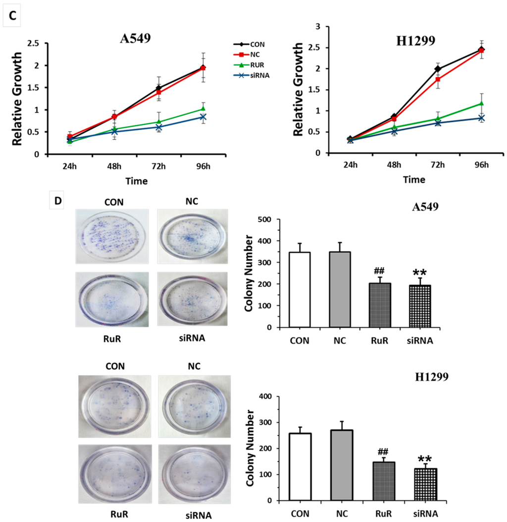 The effect of TRPV3 on lung cancer cell proliferation. The effect of RuR (1–40 µM) on A549 and H1299 cells after 24 h was analyzed by MTT (A); data are expressed as mean ± SD of triplicates. * p < 0.05 compared with control group; ** p < 0.01 compared with control group. A549 and H1299 cells were treated with TRPV3-specific siRNA for 24 h. Western blot of TRPV3 depletion efficiency in A549 and H1299 cells (B); cell growth rate was analyzed in A549 and H1299 cells treated with 20 µM RuR or TRPV3-specific siRNA by MTT (C) and colony formation assay (D). Data are expressed as mean ± SD of triplicates. ## p < 0.01 compared with control group; ** p < 0.01 compared with NC group.