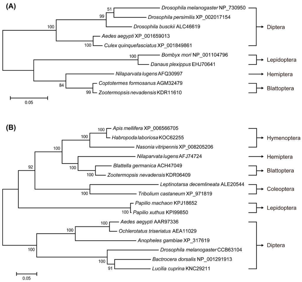 - Sheng, Z.; Xu, J.; Bai, H.; Zhu, F.; Palli, S.R. Juvenile hormone regulates vitellogenin gene expression through insulin-like peptide signaling pathway in the red flour beetle, Tribolium castaneum. J. Biol. Chem. 2011, 286, 41924–41936. [Google Scholar] [CrossRef] [PubMed]