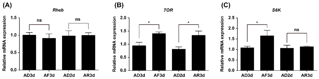 To determine whether the TOR pathway is involved in transducing AAs signals or not, qRT-PCR was used to investigate the relative expression levels of selected genes in the TOR pathway between the fat bodies of AA-deprived and -fed females. TOR and S6K expression levels were significantly decreased in the AA-deprived females (AD3d) when compared with those in AA-fed females (AF3d). Furthermore, TOR mRNA levels significantly increased after AA supplementation (AR3d) as compared with its expression in the AA-deprived females (AD2d). Meanwhile, Rheb mRNA levels showed a practically constant pattern, whether the AAs were available or not (Figure 2).