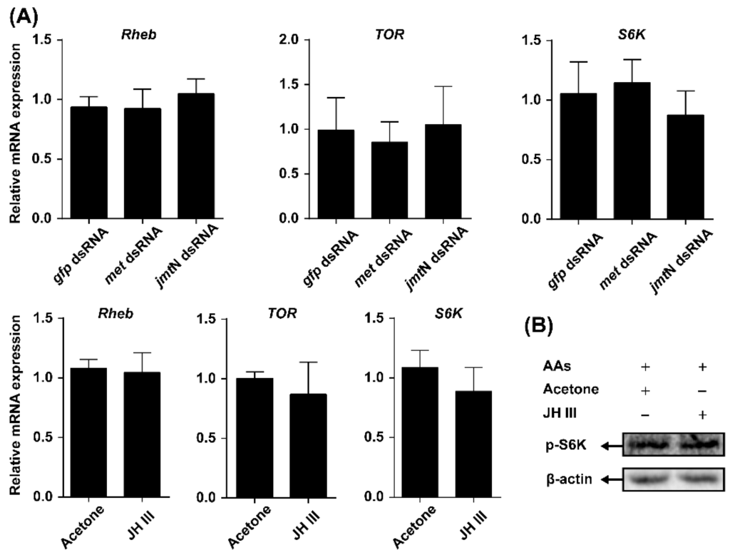 The effects of JH on the mRNA levels of TOR pathway genes and TOR activity were also investigated. Neither jmtN nor met RNAi affected Rheb, TOR or S6K expression. Similarly, the mRNA levels of the TOR pathway genes were not changed after the topical application of JH III (Figure 5A). Furthermore, phosphorylation S6K levels in females treated with JH III were similar to those observed in acetone-treated control (Figure 5B).