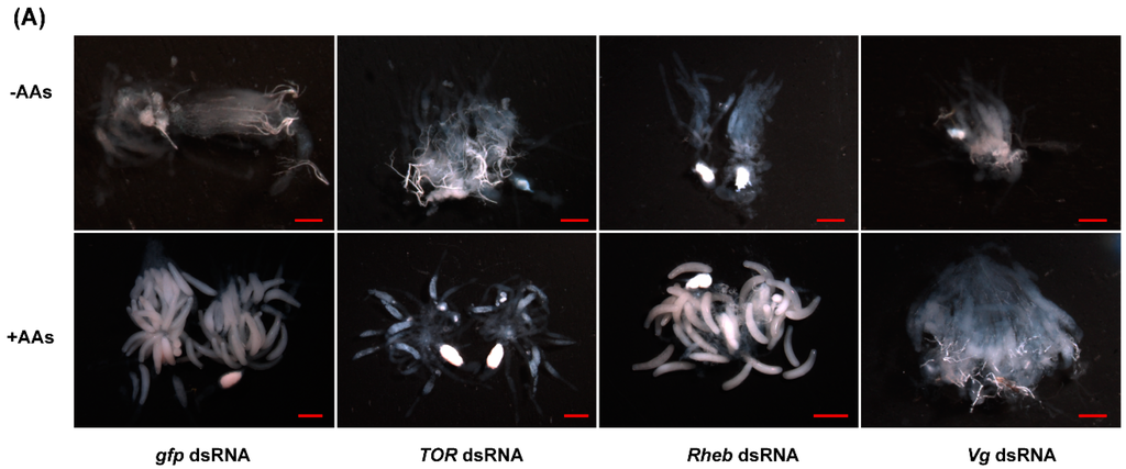 2.5. TOR Pathway and JH Are Required for AA-Mediated Ovary Development and Fecundity