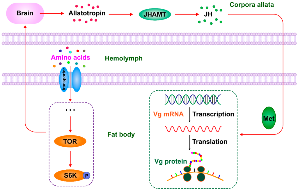 A proposed model for the TOR pathway and JH in regulating Vg synthesis responding to AAs stimulation. After feeding with normal diet, free AAs concentrations in the hemolymph are increased, the expression levels of the TOR pathway genes are elevated and S6K phosphorylation in the fat body is up-regulated. The activated TOR pathway works through some brain factors, like allatotropin, to induce JH biosynthesis in the corpora allata, and JH, in turn, activates expression of Vg gene in the fat body. Thus, the TOR pathway induces JH biosynthesis that, in turn, regulates AA-mediated vitellogenesis. JHAMT: juvenile hormone acid methyltransferase.