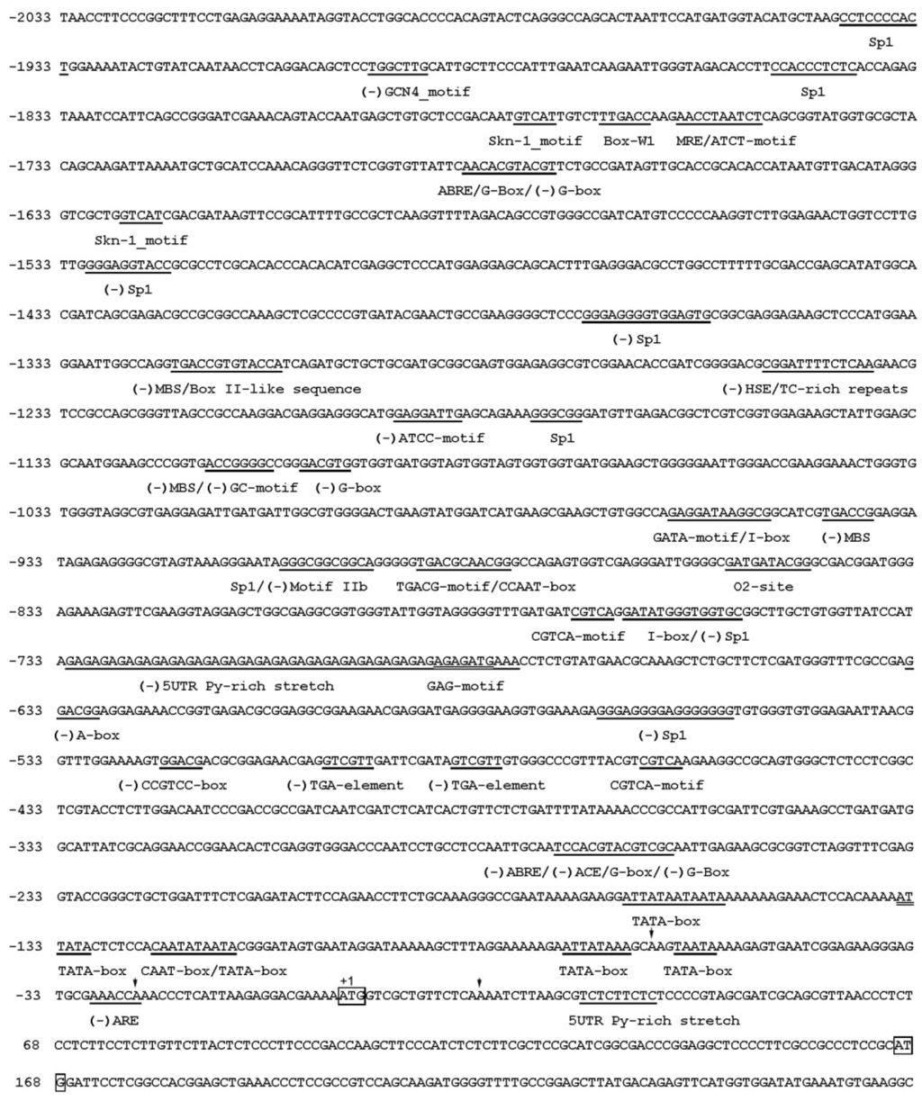 The promoter nucleotide sequence and cis-element analysis of the MaCCS gene. Motifs with high similarity to the previously identified cis-elements are underlined with the names given under the elements, and the reverse orientations are shown in brackets. Arrows indicate the transcription start sites. Two start codons (ATG) are shown in boxes. Coordinates give nucleotide positions relative to the first ATG site (+1).