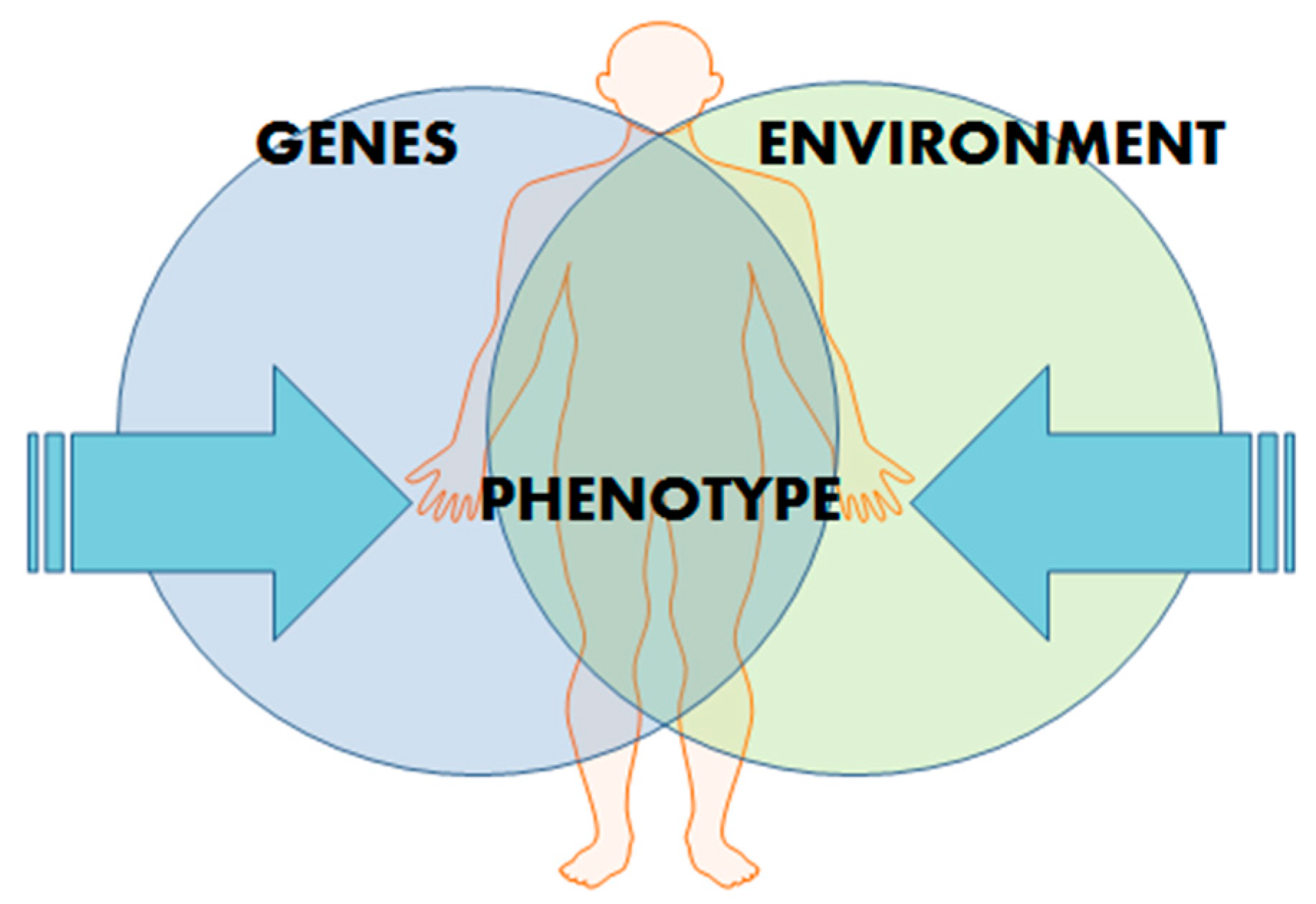 Influences on phenotype manifestation. Development of polygenic conditions, such as essential hypertension (EH), depend on a complex but interactive genetic and environmental system.