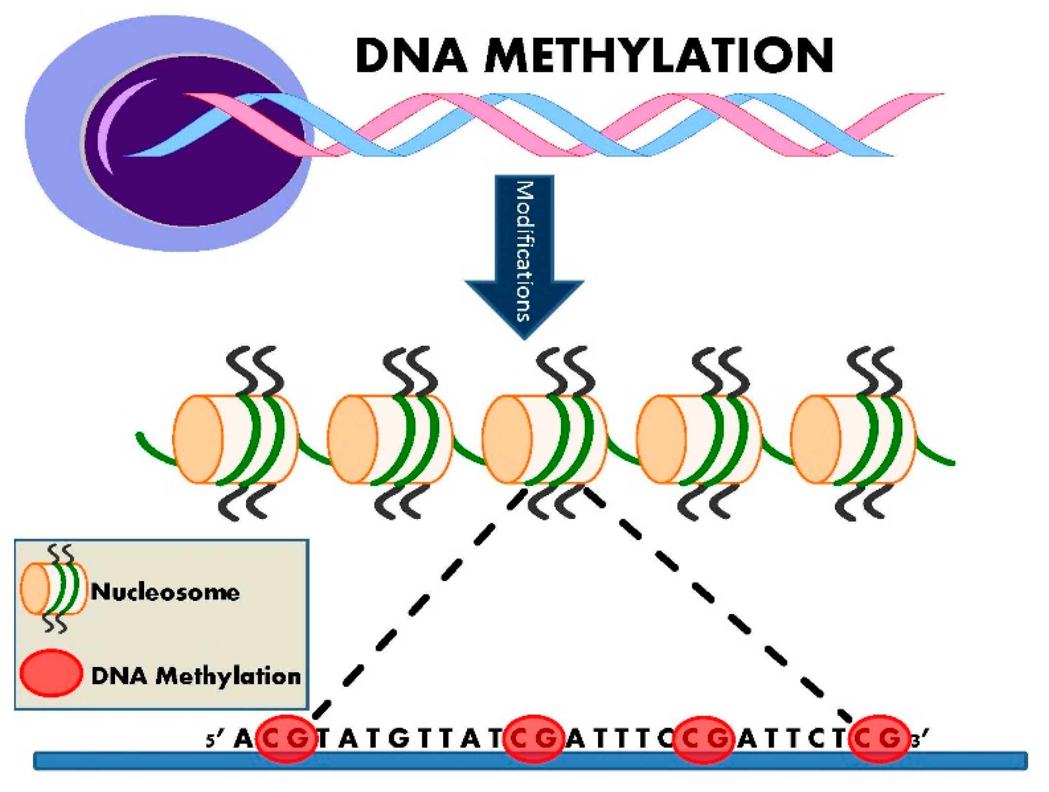Epigenetics refers to all heritable changes to the regulation of gene activity, without changes to the DNA sequence itself [11]. In other words, “epigenetics” refers to analysis of the human genome from the perspective of chromatin and chromosomes, as well as to the quintessential issue of the DNA sequence. Epigenetic modifications can be provoked by a variety of factors, including environmental influences during foetal and childhood development, chemical exposure, aging, dietary habits, and the use of recreational drugs and some prescription medications [10].
