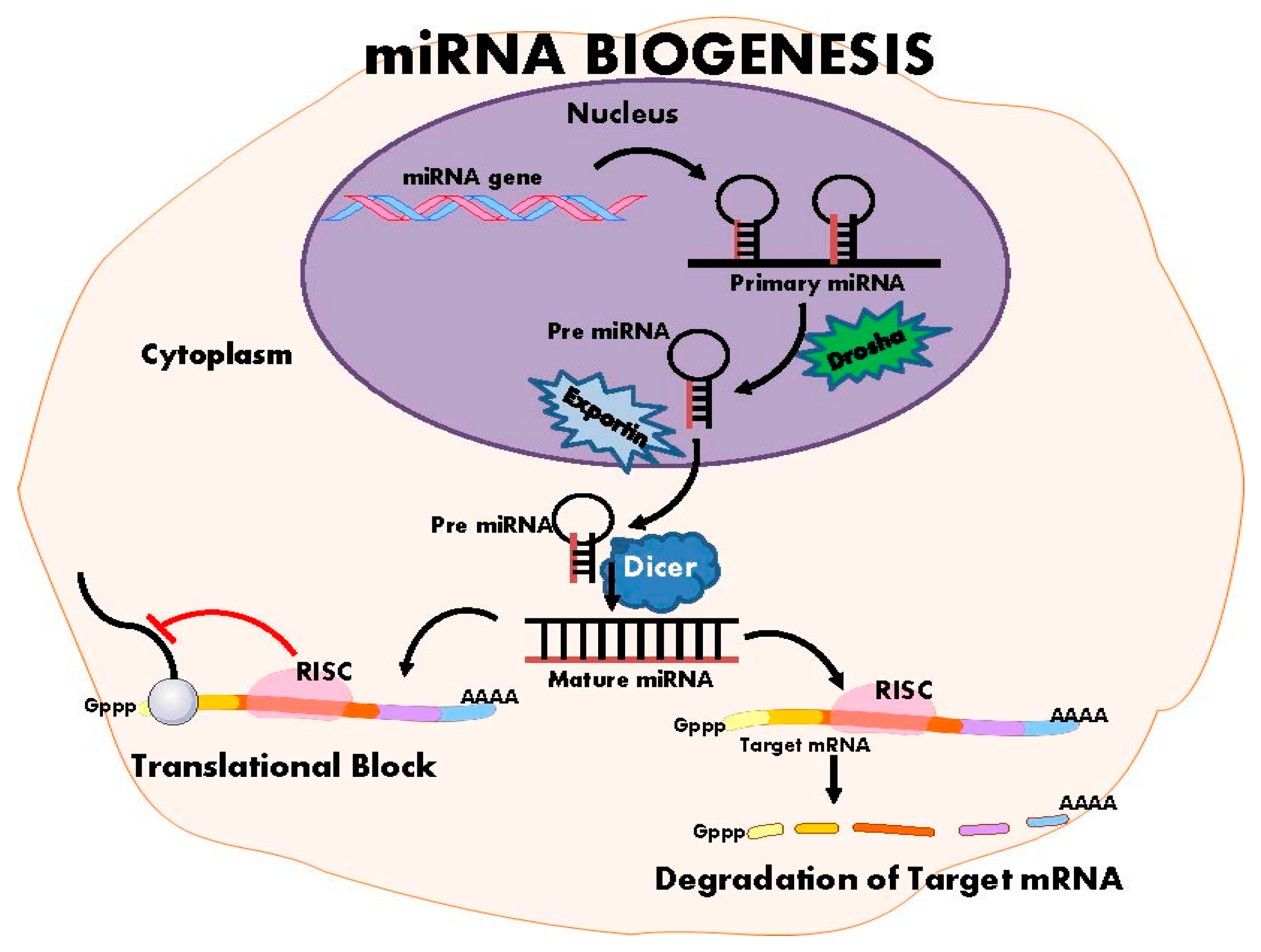 MicroRNA biogenesis. MiRNA biogenesis involves down-regulation of gene transcription via target mRNA degradation or by mRNA translation blockage. RISC: RNA-induced silencing complex.