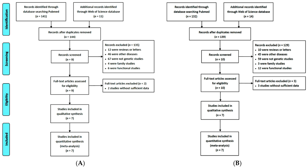 Flow chart showing the literature selection procedure used in this study: (A) RGS1 rs2816316; and (B) IL12A rs17810546.