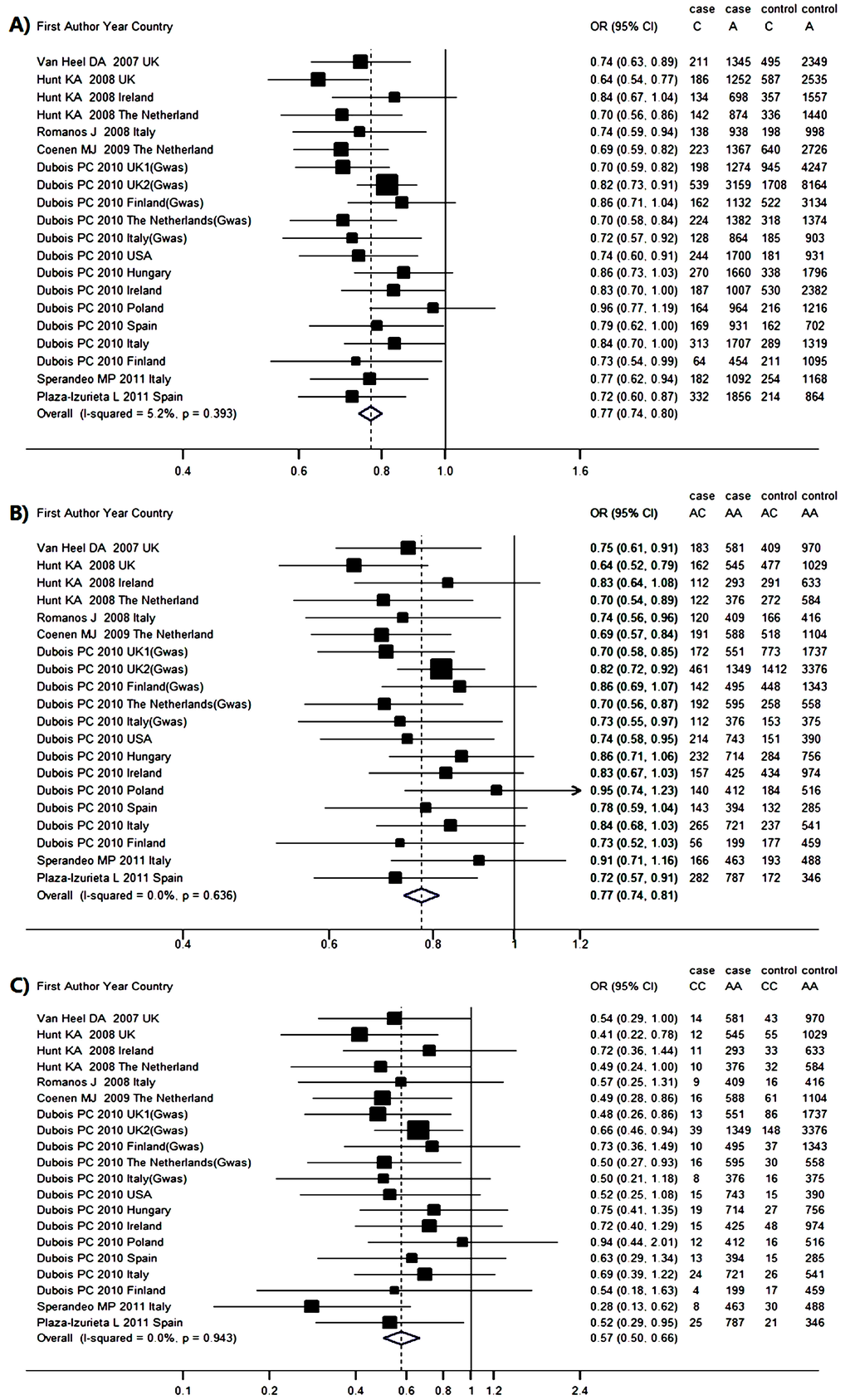 Meta-analysis forest plots of the correlations between RGS1 rs2816316 and celiac disease: (A) C vs. A; (B) AC vs. AA; and (C) CC vs. AA. The vertical dotted line and solid line represent the pooled odds ratio (OR) and the OR equals to 1, respectively. The horizontal solid lines mean the confidence intervals (CI) of OR in each population. And if the upper limit of OR exceed the top scale, arrow would replace the solid line. The size of solid squares corresponds to the weight of the study in the meta-analysis. The length of the hollow diamonds represent the CI of the pooled OR.