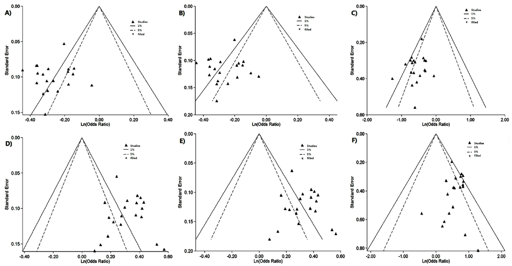 Genotype frequency and estimated OR for each study were presented in Figure 2B,C. The OR1 (AC vs. AA) (p = 0.393, I2 = 5.2%) and the OR2 (CC vs. AA) (p = 0.943, I2 = 0.0%) were homogenous. The pooled ORs were estimated by the fix-effects model for OR1 (0.77, 95% CI = 0.74–0.81, p < 0.001) and OR2 (0.57, 95% CI = 0.50–0.66, p < 0.001), both of which were significant. Harbord and Peters tests in OR1 (p = 0.741, 0.910) and OR2 (p = 0.558, 0.553) as well as contour-enhanced funnel plot (Figure 3B,C) showed no publication bias and stable results. The λ = 0.487 (95% CI = 0.319–0.724) suggested a co-dominant model effect was most likely.