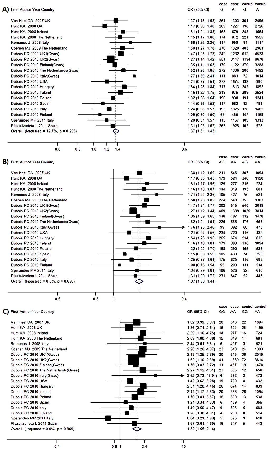 Meta-analysis forest plots of the correlations between IL12A rs17810546 and celiac disease: (A) G vs. A; (B) AG vs. AA; and (C) GG vs. AA. The vertical dotted line and solid line represent the pooled odds ratio (OR) and the OR equals to 1, respectively. The horizontal solid lines mean the confidence intervals (CI) of OR in each population. And if the upper limit of OR exceed the top scale, arrow would replace the solid line. The size of solid squares corresponds to the weight of the study in the meta-analysis. The length of the hollow diamonds represent the CI of the pooled OR.