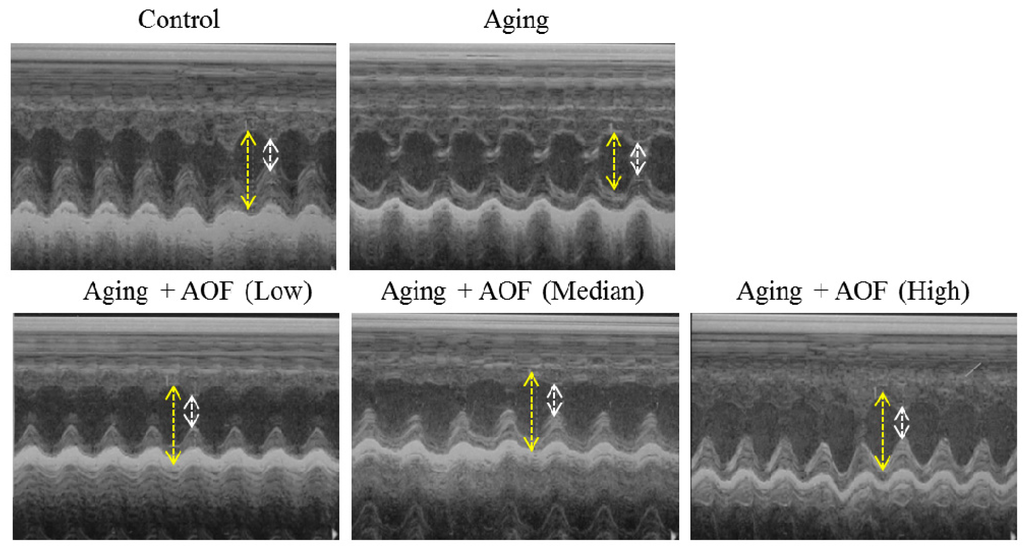 Echocardiography findings. Representative echocardiographic M-mode images from rats with d-galactose and Alpinate Oxyphyllae Fructus (AOF) treatment. AL (AOF low), AM (AOF medium), AH (AOF high) represent the doses of 50, 100 and 150 mg of Alpinate Oxyphyllae Fructus per kg BW (Body weight). The long yellow arrow indicates cardiac diastole, and the short white arrow shows cardiac systole.