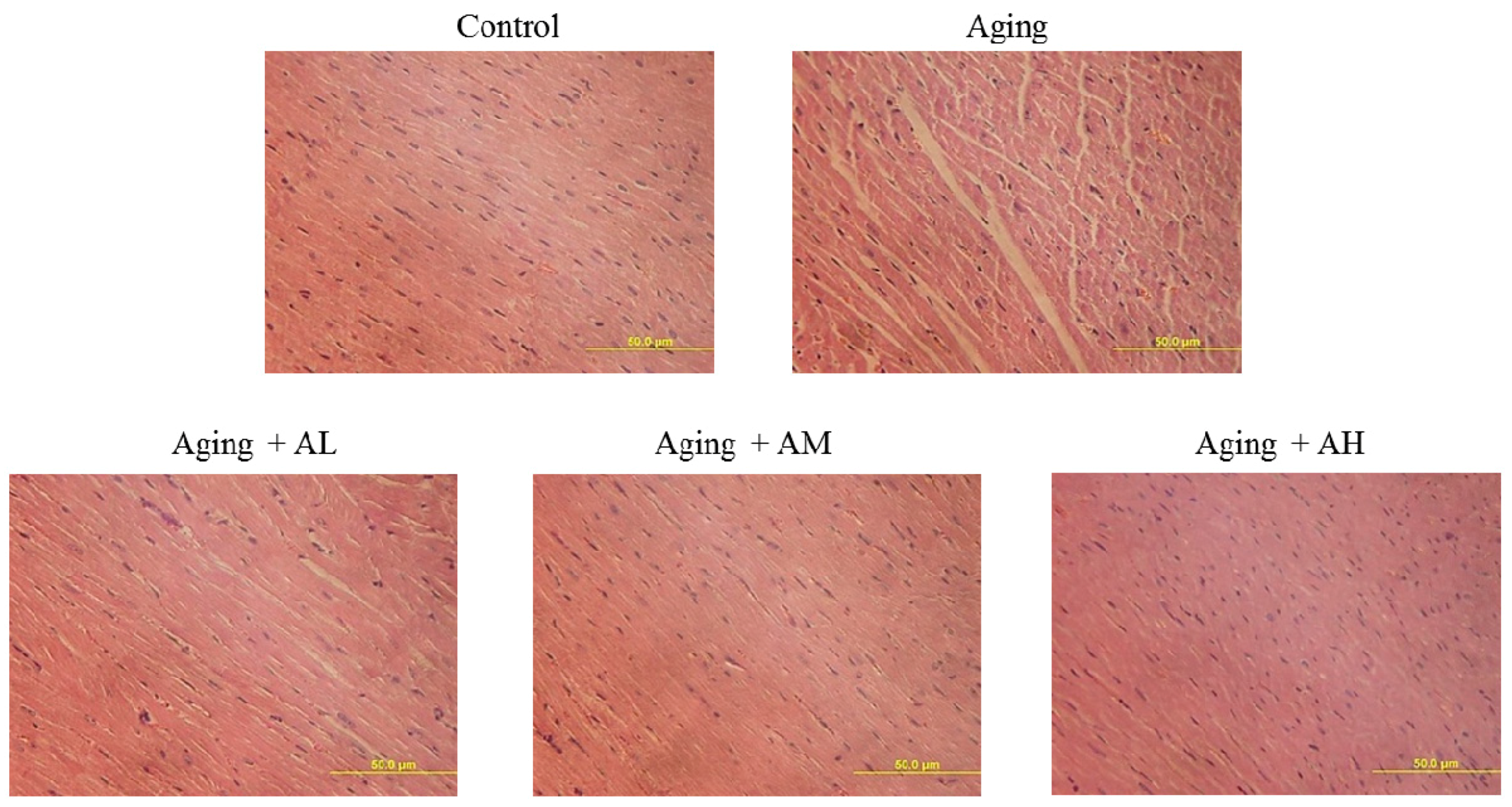 To investigate the changes in cardiac architecture, hematoxylin and eosin staining of tissue slides was performed to image cardiomyocytes (Figure 2). After viewing ×400 magnified images, the control group had normal myocardial cell architecture and volume. However, the aging groups exhibited abnormal myocardial architecture and volume due to aging. Cardiomyocytes from the aging rats were disordered with more space between the cells. However, the AOF treatment groups had significantly reduced disordered arrangement and space between cardiomyocytes (Figure 2).