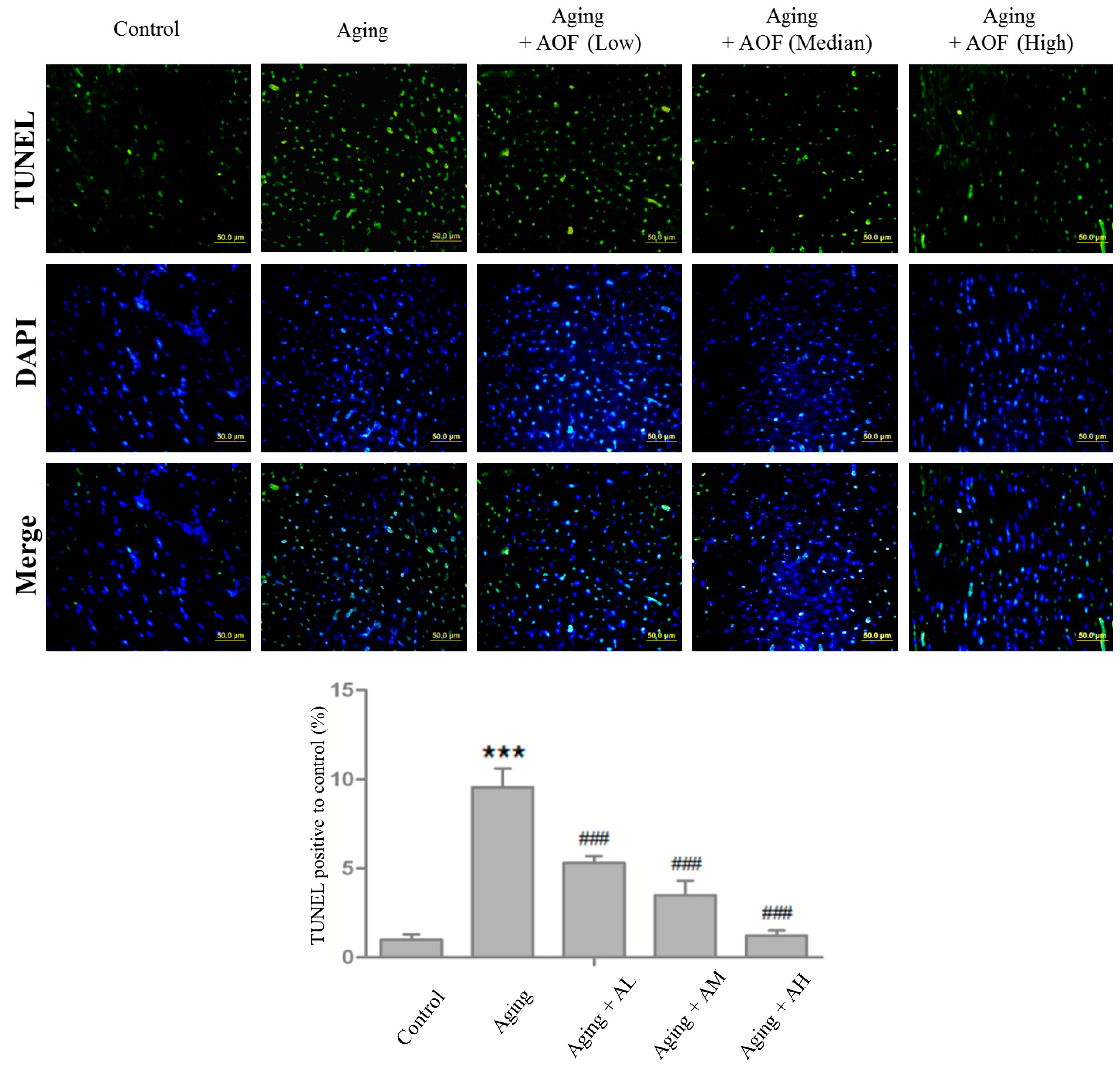 AOF treatment inhibits d-galactose-induced aging and apoptosis in Sprague–Dawley (SD) rat cardiac tissue. Cardiac tissue sections were stained with 4,6-diamidino-2-phenylindole (DAPI) (blue, nucleus) and TUNEL assay (green, double-stranded DNA break or single-stranded DNA nicks.), respectively. The statistical results were shown from three independent experiments; mean ± S.D.; *** p < 0.001, represent a significant difference versus the control; ### p < 0.001, represent a significant difference versus the aging group.