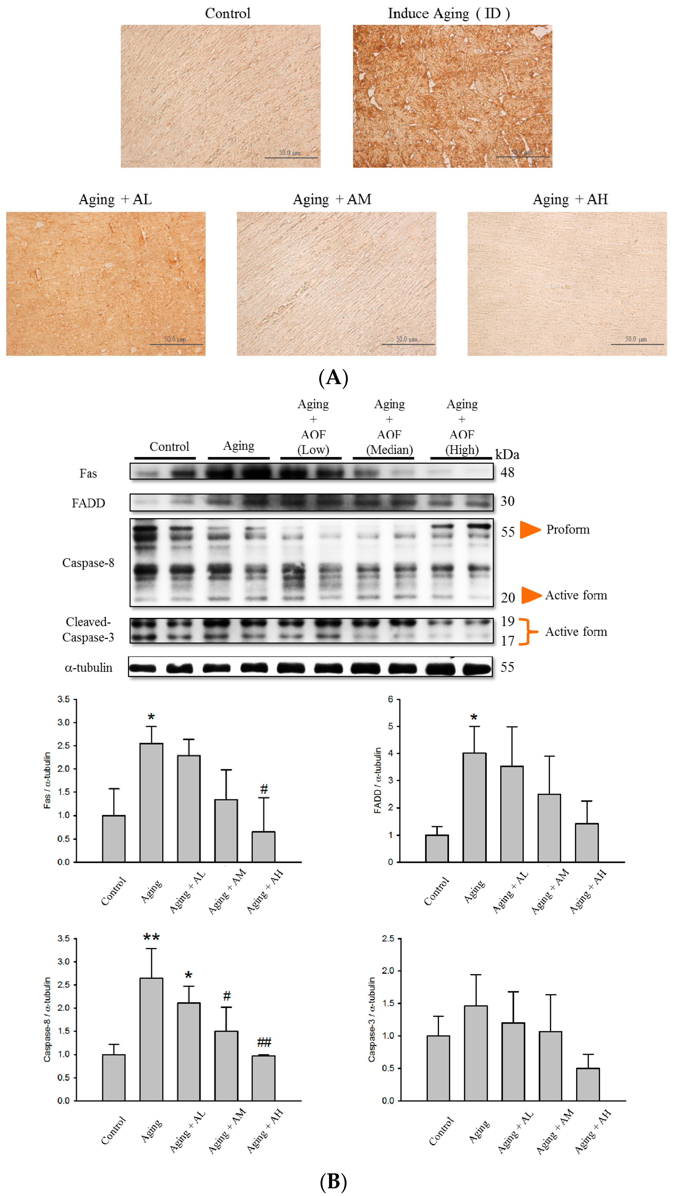 Thirty-two male 8-week-old Sprague–Dawley (SD) rats weighing approximately 220 ± 20 g were used in the research. Animals were purchased from BioLASCO Taiwan Co., Ltd., (Taipei, Taiwan) and cared for at the University Animal center, China Medical University in accordance with Institutional Animal Care and Use Committee regulations. Rats were kept in a temperature-controlled (23 ± 2 °C) room with a 12:12-h light–dark cycle, and water and rat chow were provided ad libitum. After a 2-week acclimation period, the rats were randomly divided into five groups and named as control group, aging group (which was intraperitoneal (IP) injection injected with 150 mg/kg/day of d-galactose for 8 weeks), AOF low (AL, aging rats with 50 mg/kg/day of AOF), AOF medium (AM, aging rats with 100 mg/kg/day of AOF), AOF high (AH, aging rats with 150 mg/kg/day of AOF). The AOF was administered to the AOF group using oral gavage and the other groups were given the same volume of control solution. Rats were sacrificed at the end of the treatment, and heart tissue was immediately collected or stored at −80 °C until further use. All experimental procedures were following the National Institutes of Health (NIH) Guide for the Care and Use of Laboratory Animals. The animal use experimental protocol was approved by the Institutional Animal Care and Use Committee (IACUC) of China Medical University, Taichung, Taiwan (No.102-71-N; 15 August 2013).