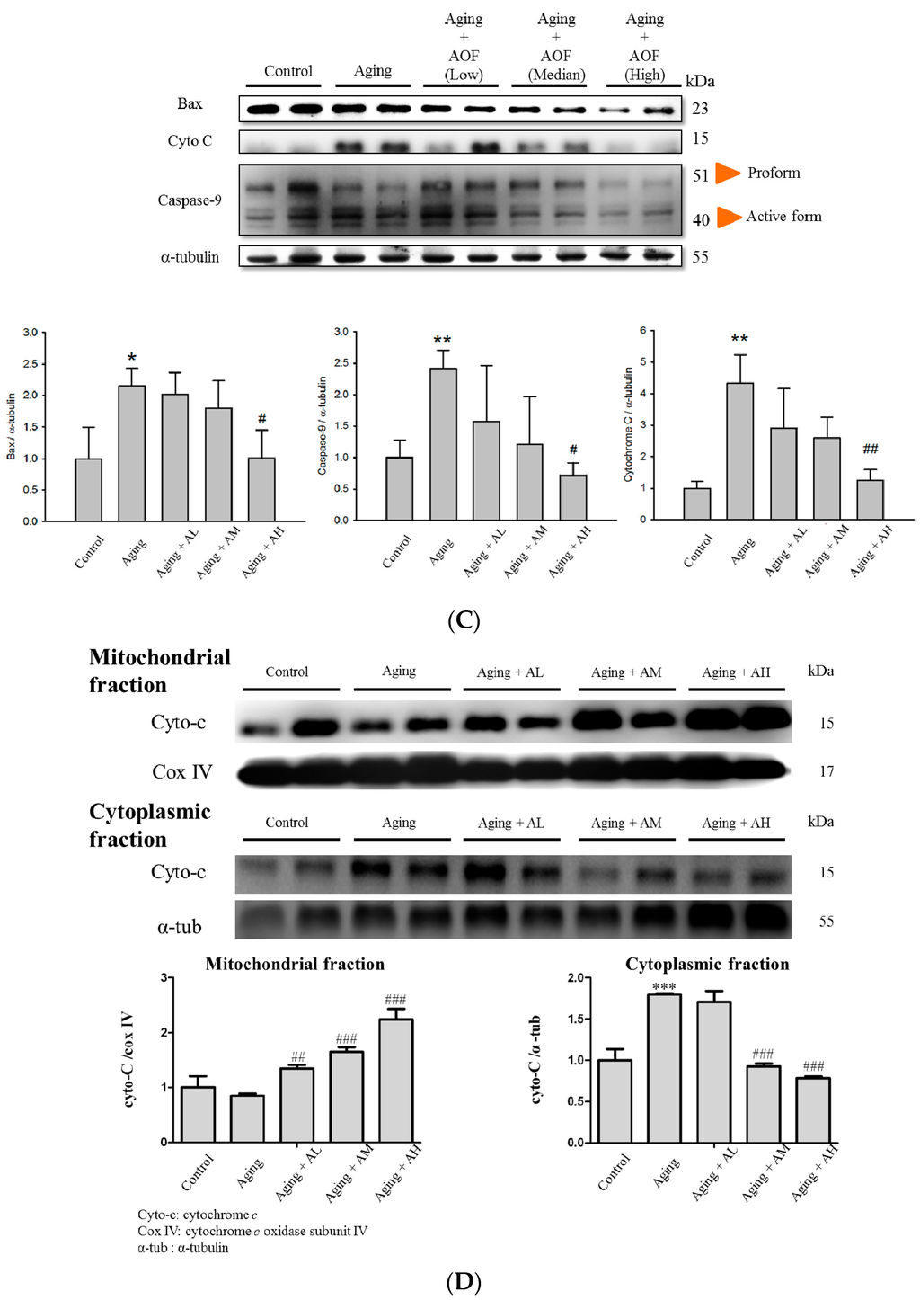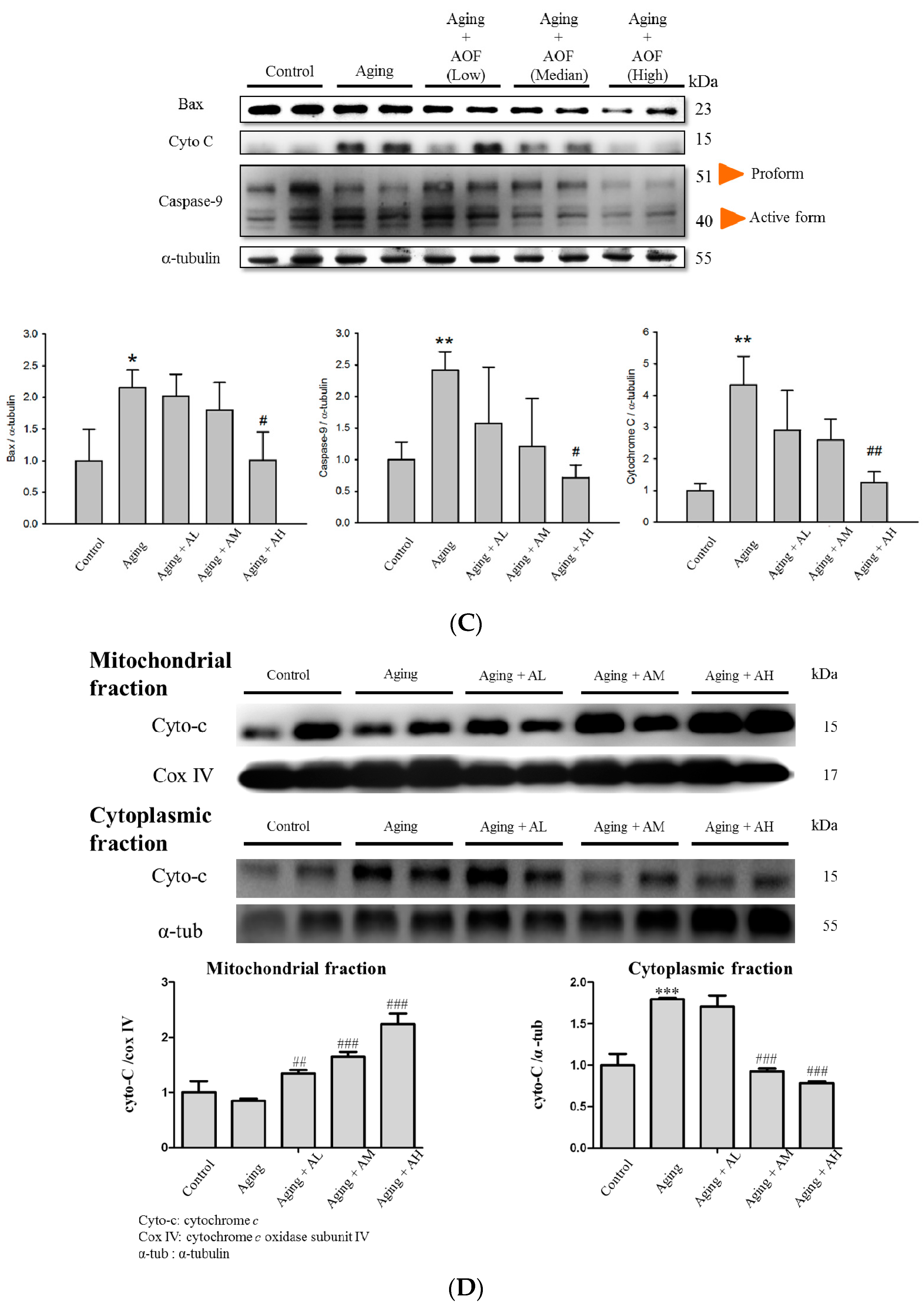 Effect of AOF on d-galactose -induced apoptosis in SD rat cardiac tissue. (A) Immunohistochemical analysis for cleaved Caspase-3 in sections from the SD rat cardiovascular tissue. The protein levels decreased with AOF treatment and are shown in a brown color. Final magnifications: ×400 (bar, 50 μm). The total protein of SD rat cardiac tissue extracts was separated by 12% SDS polyacrylamide gel electrophoresis (SDS-PAGE), transferred to polyvinylidene difluoride (PVDF) membranes, and immunoblotted with antibodies against Fas, Fas-associated death domain (FADD), caspase-8, cleaved caspase-3, B-cell lymphoma 2-associated X protein (Bax), cytochrome c and caspase-9 antibody to detect apoptotic markers expression (B,C); Levels of cytochrome c were determined from cytoplasmic and from the mitochondria (D). Equal loading was assessed with an anti-α-tubulin antibody. These blots were quantified by densitometry. α-tubulin served as a loading control. Data are presented as means ± S.D. Bars indicate averages, * p < 0.05; ** p < 0.01; *** p < 0.001, represent a significant difference versus the control; # p < 0.05; ## p < 0.01; ### p < 0.001, represent a significant difference versus the aging group. n = three independent experiments for each data point.