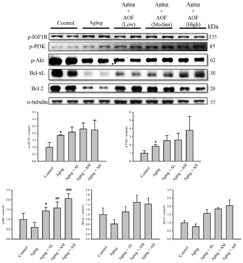 Effect of AOF on d-galactose-induced survival in SD rat cardiac tissue. The total protein of SD rat cardiac tissue extracts was separated by 12% SDS-PAGE, transferred to PVDF membranes, and immunoblotted with antibodies against IGF1R, p-PI3K, AKT, Bcl-xL and Bcl2 antibody to detect survival markers expression. Equal loading was assessed with an anti-α-tubulin antibody. These blots were quantified by densitometry. α-tubulin served as a loading control. Data are presented as means ± S.D. Bars indicate averages, * p < 0.05, represent a significant difference versus the control; # p < 0.05; ## p < 0.01; ### p < 0.001, represent a significant difference versus the aging group. n = three independent experiments for each data point.