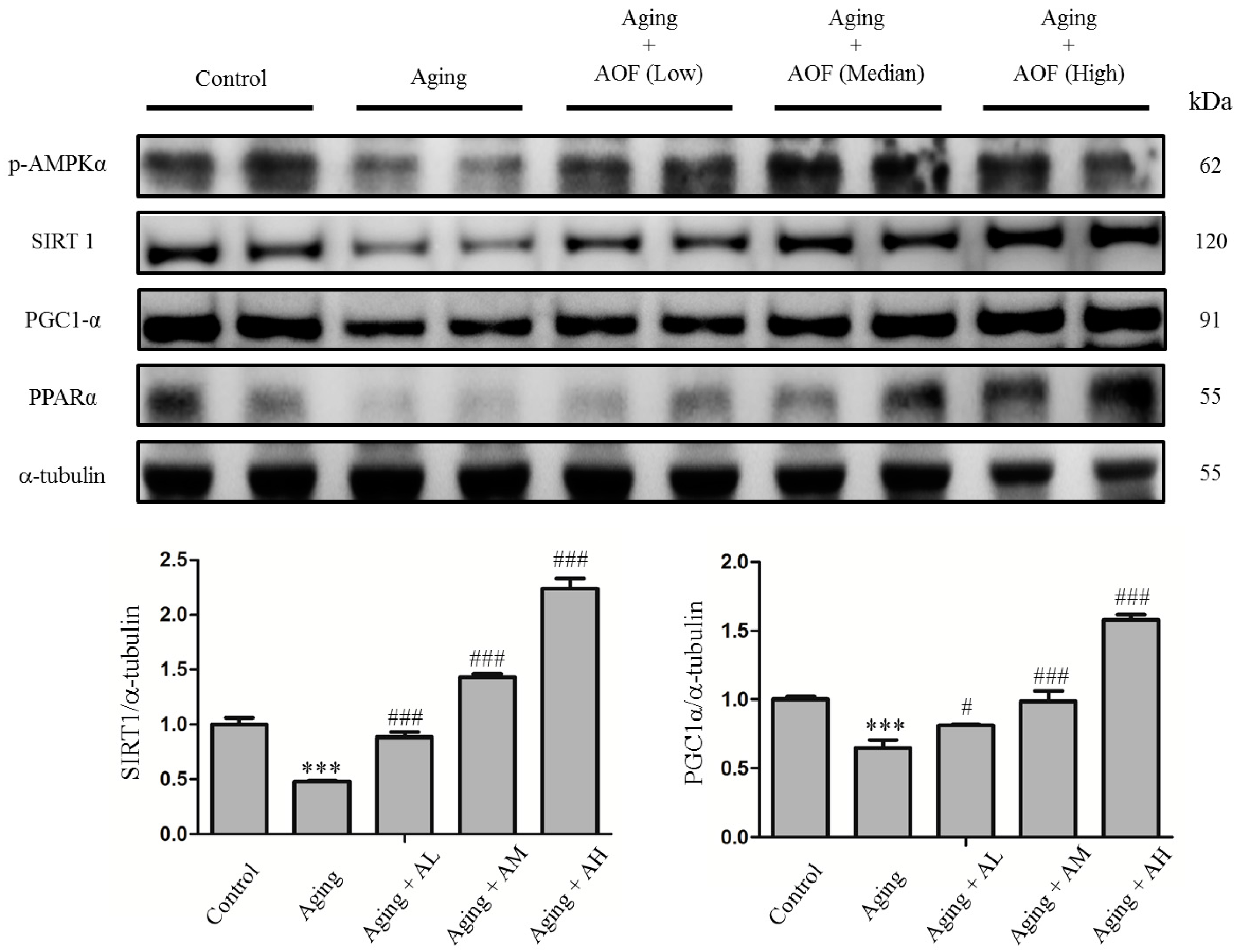 Effect of AOF on d-galactose-induced Sirtuin 1 (SIRT1) pathway related protein in SD rat cardiac tissue. The total protein of SD rat cardiac tissue extracts was separated by 12% SDS-PAGE, transferred to PVDF membranes, and immunoblotted with antibodies against p-AMPK, SIRT1, PGC-1α and PPARα antibody to detect survival markers expression. Equal loading was assessed with an anti-α-tubulin antibody. These blots were quantified by densitometry. α-tubulin served as a loading control. Data are presented as means ± S.D. Bars indicate averages, *** p < 0.001, represent a significant difference versus the control; # p < 0.05; ### p < 0.001, represent a significant difference versus the aging group. n = three independent experiments for each data point.