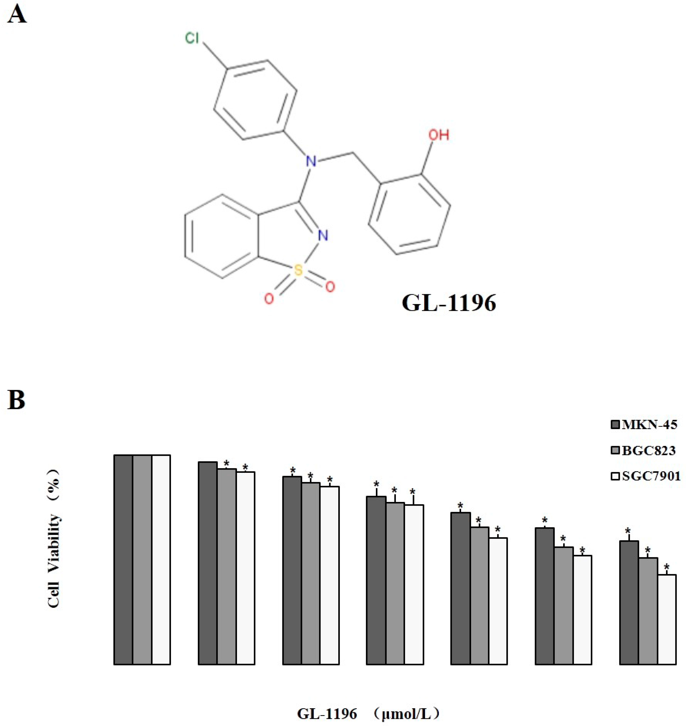 Chemical structure and the inhibitory proliferative effect on human gastric cancer cells of GL-1196. (A) chemical structure of GL-1196 (C20H15ClN2O3S); (B) the effect of GL-1196 on proliferation of human gastric cancer cells by MTT assay. The cell viability is shown as bar diagram ± SEM, * p < 0.05.