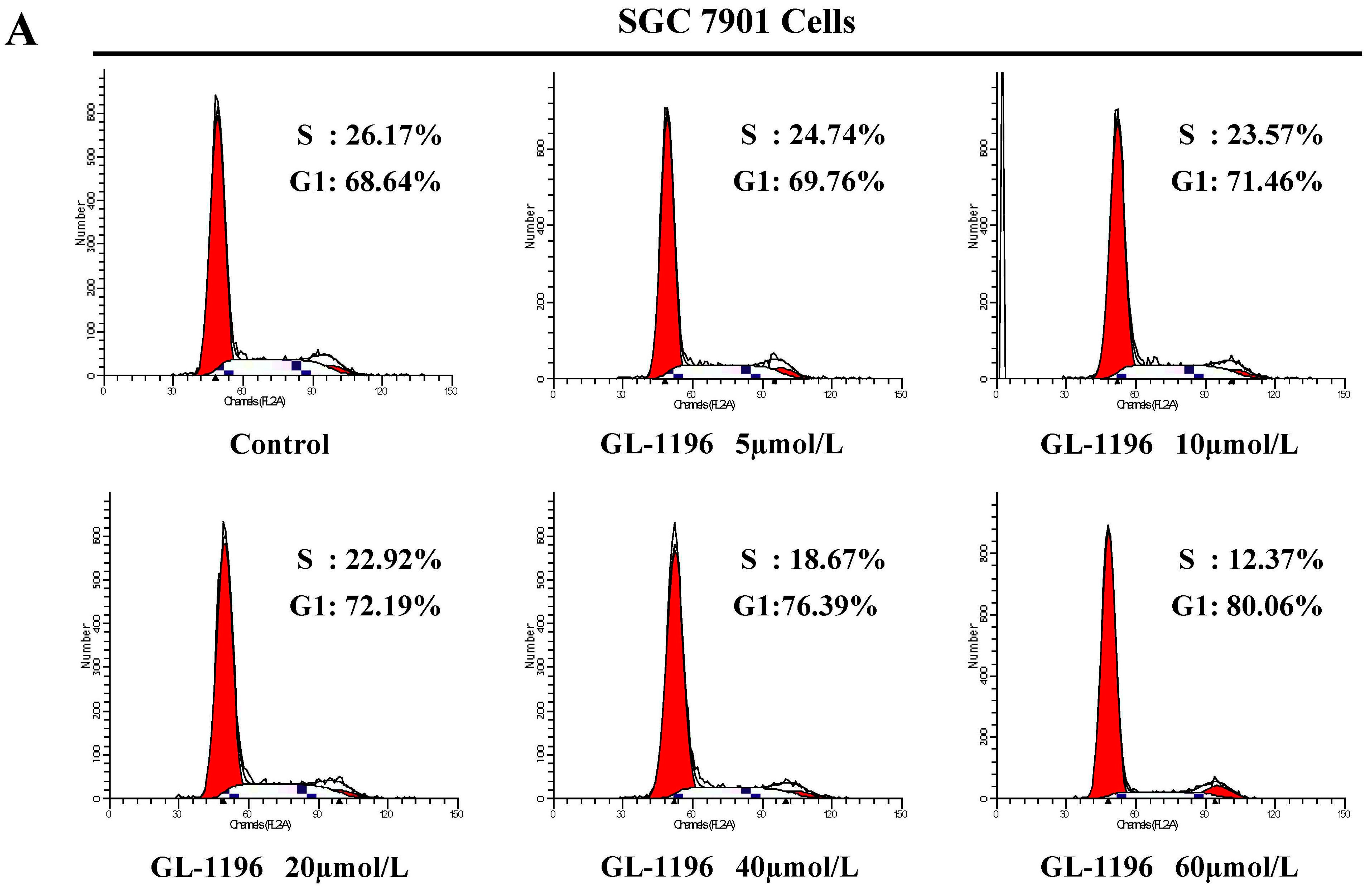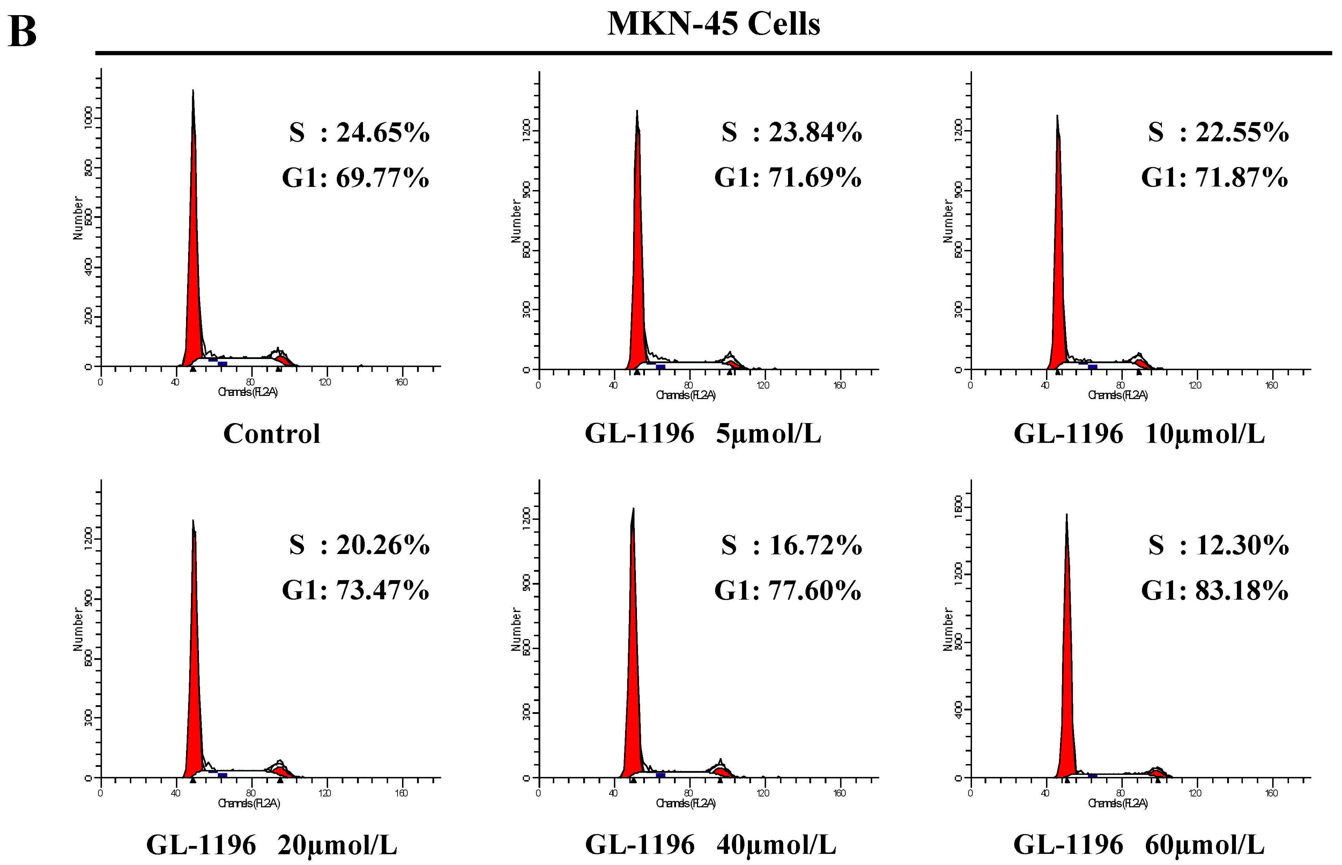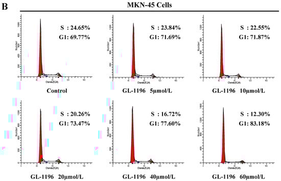 GL-1196 suppresses the transition of SGC7901 (A) and MKN-45 (B) cells from G1 to S phase.