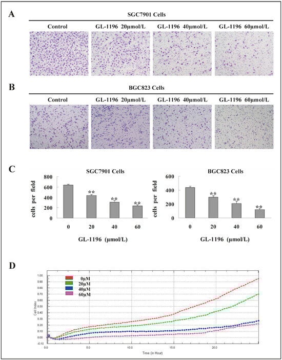GL-1196 suppresses the invasive capacity of human gastric cancer cells. The invasive capability of SGC7901 (A) and BGC823 (B) cells was evaluated by chemotaxis chamber matrigel invasion assay. The magnification is 100×, and the number of invading cells is shown as bar diagram ± SEM; (C) the left one is for SGC7901 cells; the right one is for BGC823 cells, ** p < 0.01; (D) the effect of GL-1196 on MKN-45 cells invasive ability was detected by real-time invasion monitoring.