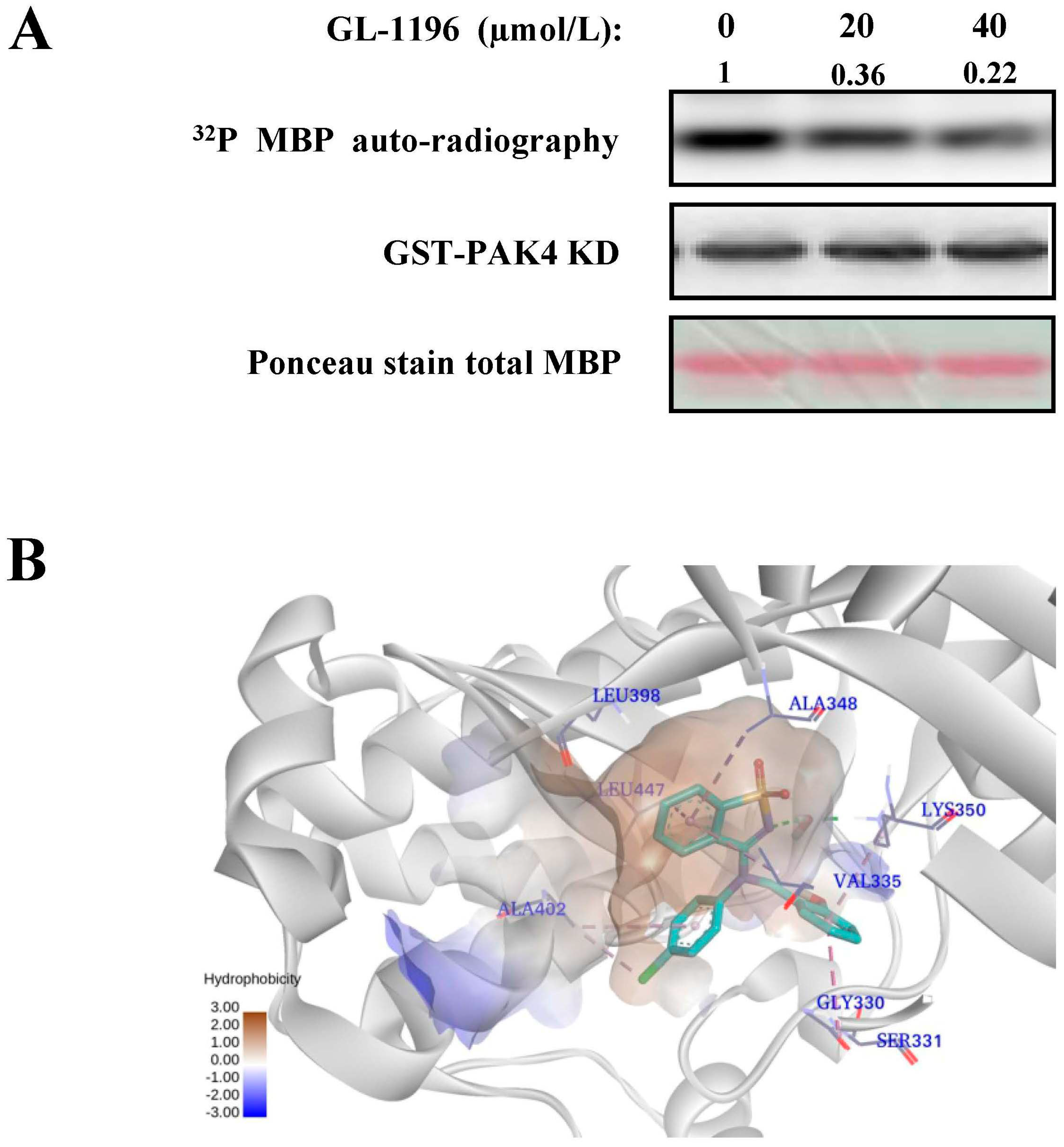 GL-1196 inhibits PAK4 kinase activity. (A) the effect of GL-1196 on PAK4 kinase activity was detected by kinase assay; (B) the binding mode of GL-1196 within PAK4 binding site. The green structure indicates the chemical structure of GL-1196.