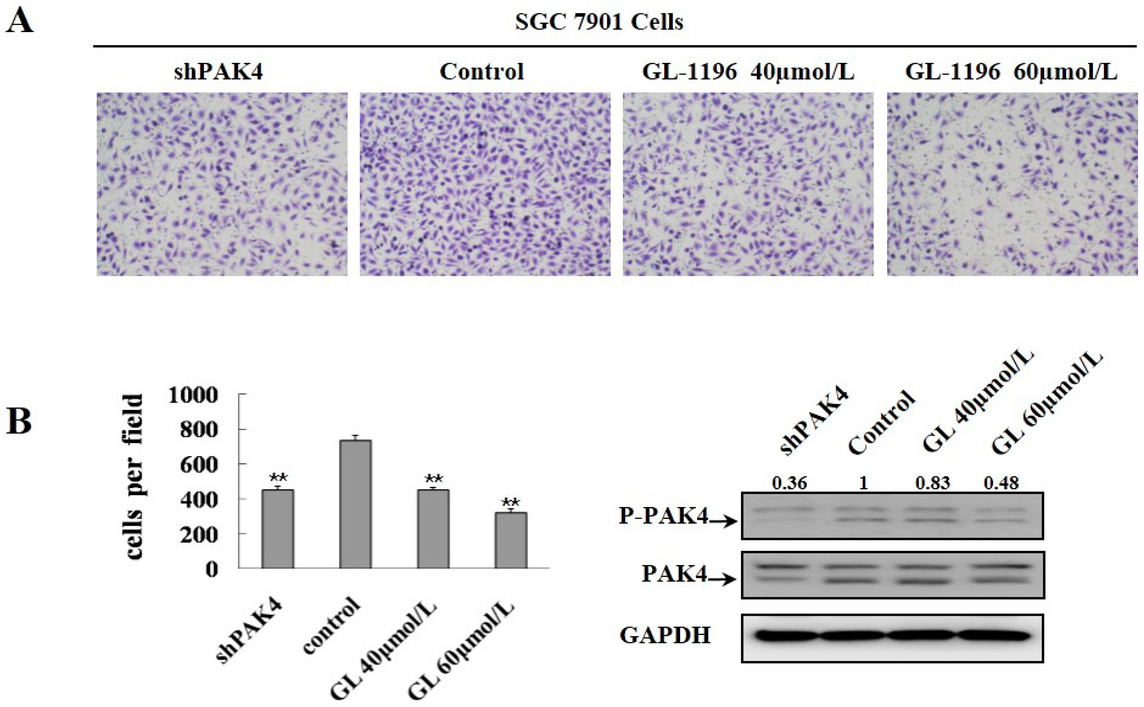 GL-1196 treatment showed the similar inhibitory effect on cell invasion by PAK4 knockdown. (A) the invasive ability of SGC7901 treated with GL-1196 and in which PAK4 knockdown was evaluated by chemotaxis chamber matrigel invasion assay. The magnification is 100×, and the number of invading cells is shown as bar diagram ± SEM (B left), ** p < 0.01. Western blot analysis shows the protein level of PAK4 in cells (B right).