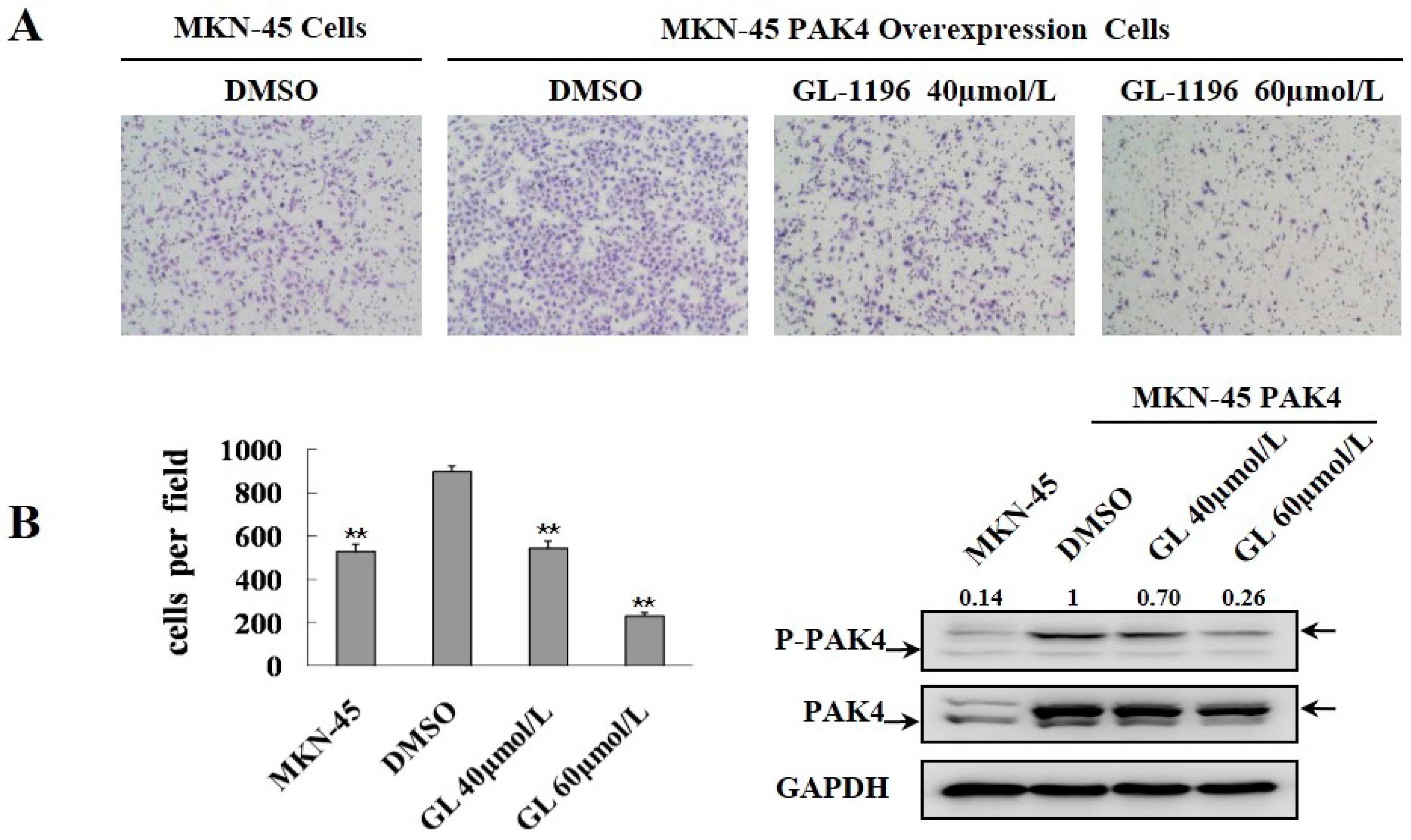 GL-1196 treatment exhibited the same inhibitory invasive effect on PAK4-overexpression MKN-45 cells as the control MKN-45 cells. (A) the invasive ability of PAK4-overexpression and control MKN-45 cells was evaluated by using a Boyden chamber matrigel invasion assay. The magnification is 100×, and the number of cells invading is shown as bar diagram ± SEM (B left), ** p < 0.01. Western blot analysis shows the protein level of PAK4 in cells (B right).