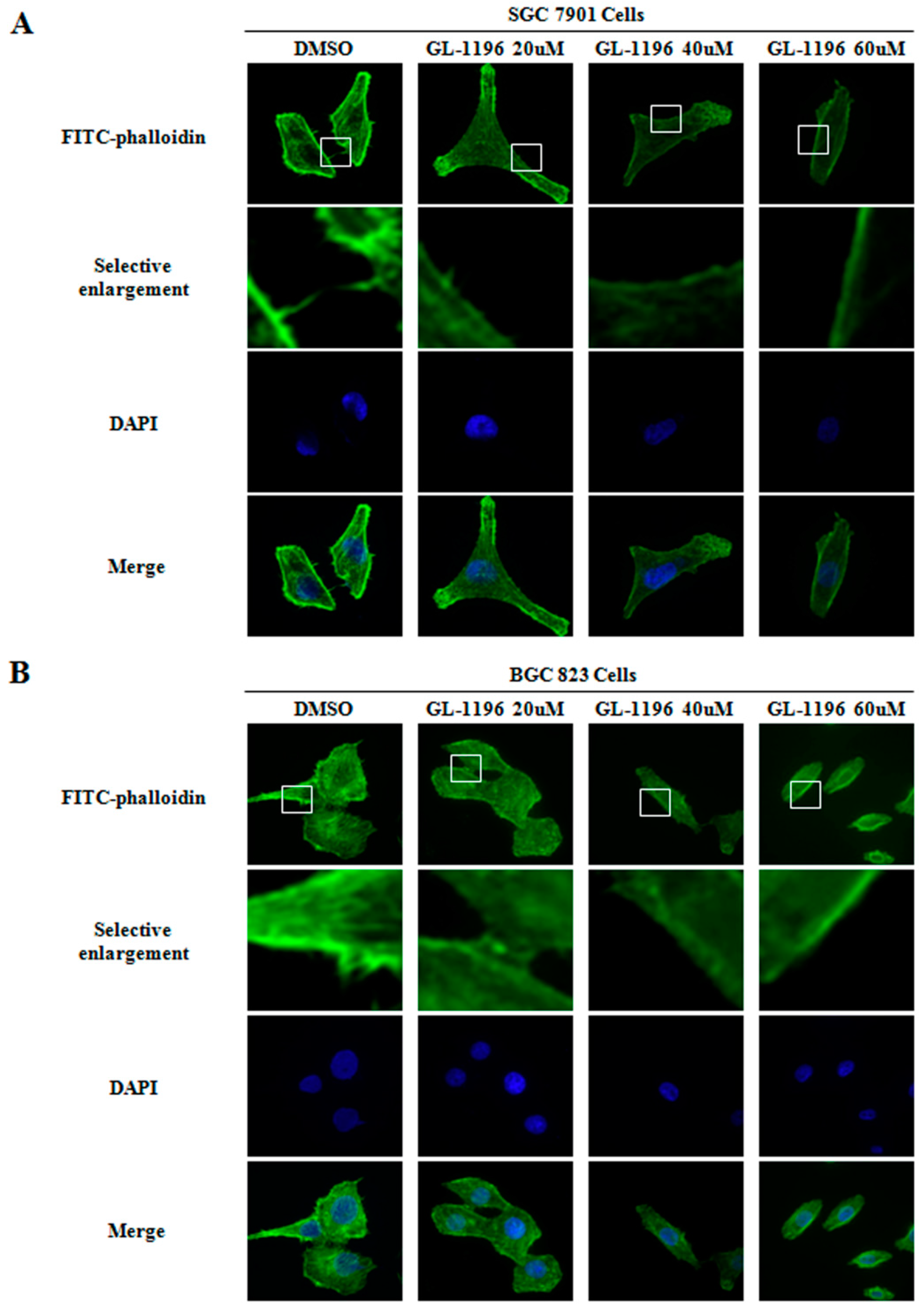 SGC7901 and BGC823 cells grown on glass cover slips were exposed toindicated concentrations of GL-1196 or DMSO for 24 h. Then, cells were fixed in methanol for 15 min, and blocked with normal goat serum for 1 h. Subsequently, cells were incubated with FITC-phalloidin (Sigma, Munich, Germany) for 1 h, washed three times in PBT (PBS with 1% TritonX-100). The DAPI (4′,6-diamidino-2-phenylindole) was used to stain the DNA (blue). Confocal scanning analysis was conducted via a Leika laser confocal scanning microscope (Leika, Wetzlar and Mannheim, Germany). Sequential laser excitation was used to minimize the possibility of fluorescent emission bleed-through.