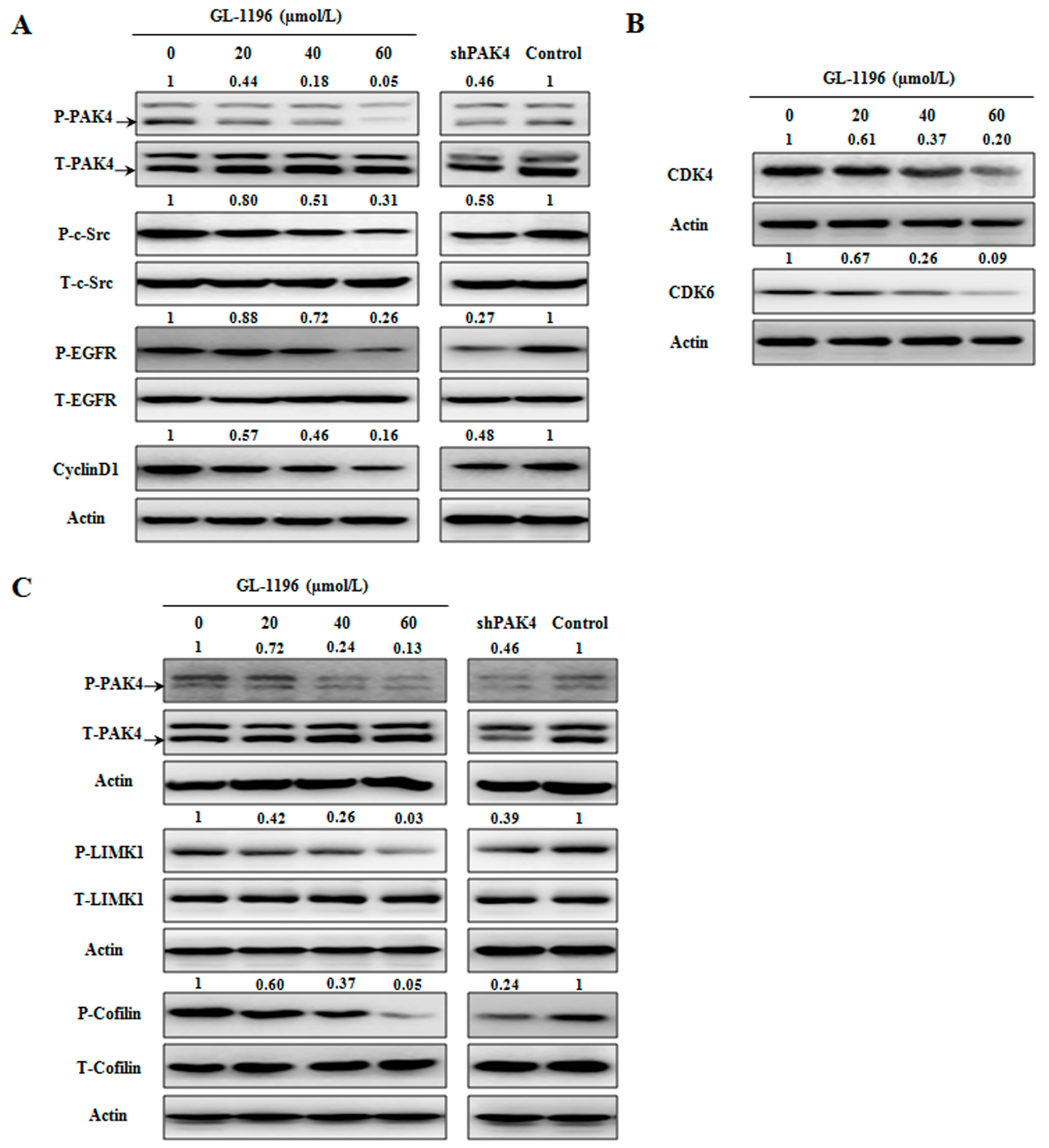The effect of GL-1196 on PAK4-mediated signaling pathways involving proliferation and invasion. (A) GL-1196 inhibits PAK4/c-Src/EGFR/cyclinD1 pathway; (B) GL-1196 down-regulated the expression of CDK4/6; (C) GL-1196 inhibits PAK4/LIMK1/cofilin pathway.