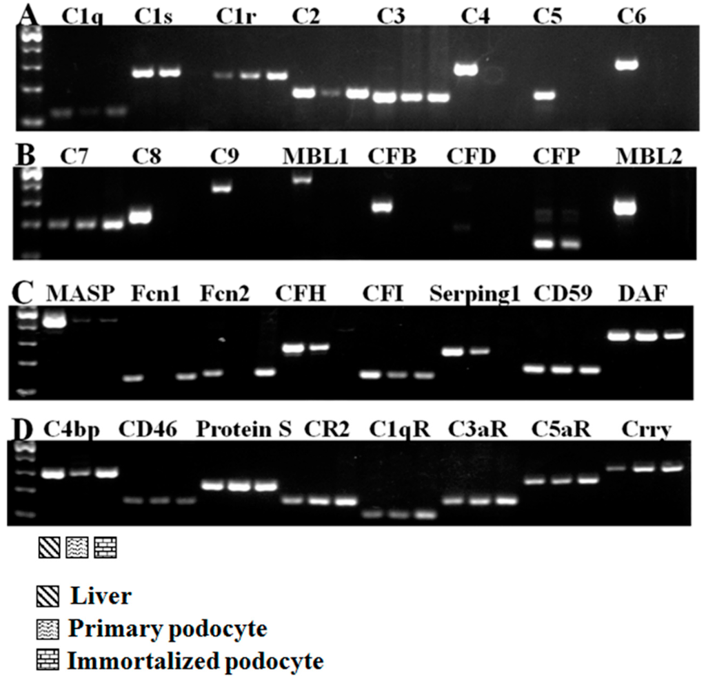 The expression of complement genes in primary cultured murine podocytes and immortalized murine podocytes. (A–D) Primary cultured podocytes and immortalized murine podocytes expressed the complement factors C1q, C1r, C2, C3, C7, MASP, CFI, DAF, CD59, C4bp, CD46, Protein S, CR2, C1qR, C3aR, C5aR, and Crry. Neither the primary nor the immortalized podocytes exhibited specific bands for C4, CFB, CFD, MBL1, MBL2, C5, C6, C8, or C9 (9/32). Total RNA from mouse liver tissue was used as a positive control. n = 3.