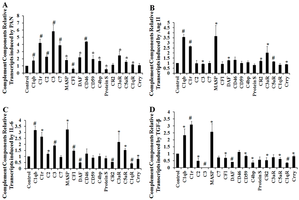 Having shown that podocytes express many complement genes under normal physiological conditions, we sought to understand how the expression of these genes was affected after stimulation with podocyte injury factors. Cultured podocytes were treated with 50 μg/mL puromycin aminonucleoside (PAN), 10−6 M angiotensin II (Ang II), 100 ng/mL interleukin-6 (IL-6), or 5 ng/mL transforming growth factor-β (TGF-β). Complement gene expression was quantitatively analyzed using quantitative real-time RT-PCR. Several complement genes were regulated after podocyte injury (Figure 2A–D), but not C4, CFB, CFD, MBL1, MBL2, C5, C6, C8, nor C9.