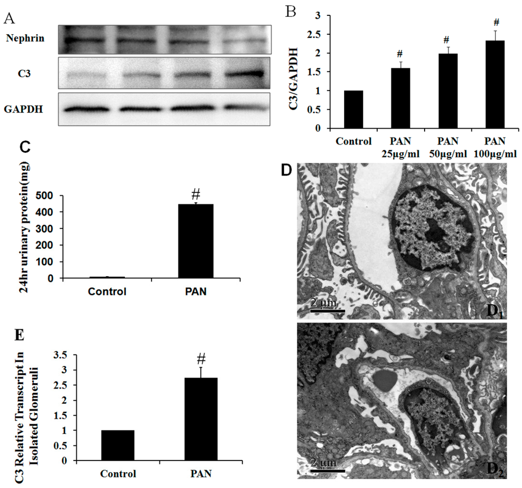 C3 expression increased in podocytes after PAN treatment for 24 h and in isolated glomeruli. (A) The C3 protein level was determined by Western blot analysis; (B) The protein amounts were quantified and normalized to GAPDH expression. n = 3; (C) Compared to the control groups, twenty-four hour urine protein levels increased significantly at day 10 after PAN injection; (D1) Ultrastructural analysis showed that the foot processes were long and thin in control group rats; (D2) Ten days after PAN injection, the foot processes were no longer present, and diffuse and widespread fusion was observed. Scale bar: 2 mm; (E) C3 mRNA expression levels were evaluated by quantitative real-time PCR in isolated glomeruli. Data are presented as means ± SD. n = 5. # p < 0.01 vs. control group.