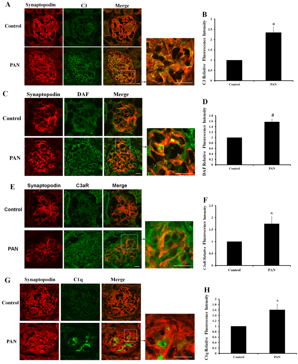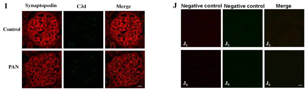 Representative complement immunofluorescent staining in the PAN rat nephropathy model. Immunofluorescent staining of C3 (A), DAF (C), C3aR (E), C1q (G), and C3d (I), with synaptopodin in a PAN nephropathy rat model. Complement factors are labeled in green, and synaptopodin is labeled in red. Scale bar for overview: 20 μm; higher magnification: 30 μm. (B,D,F,H) Immunofluorescence staining of C3, C3aR, DAF, and C1q in glomeruli, the positive signals were quantified as the relative fluorescence intensity. Each column represents the mean value that was derived from four glomeruli in a single experiment. The results are presented as the mean value of three independent experiments; (J) Images J1–6 are the negative controls by without primary antibodies; images J1,2,4,5 were incubated with Alexa Fluor®596 goat anti-mouse IgG, Alexa Fluor®488 goat anti-rabbit IgG, Alexa Fluor®596 goat anti-rabbit IgG, and Alexa Fluor®488 goat anti-mouse IgG, respectively. Data are presented as means ± SD. * p < 0.05 vs. control group; # p < 0.01 vs. control group.